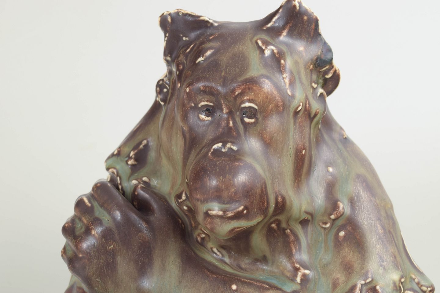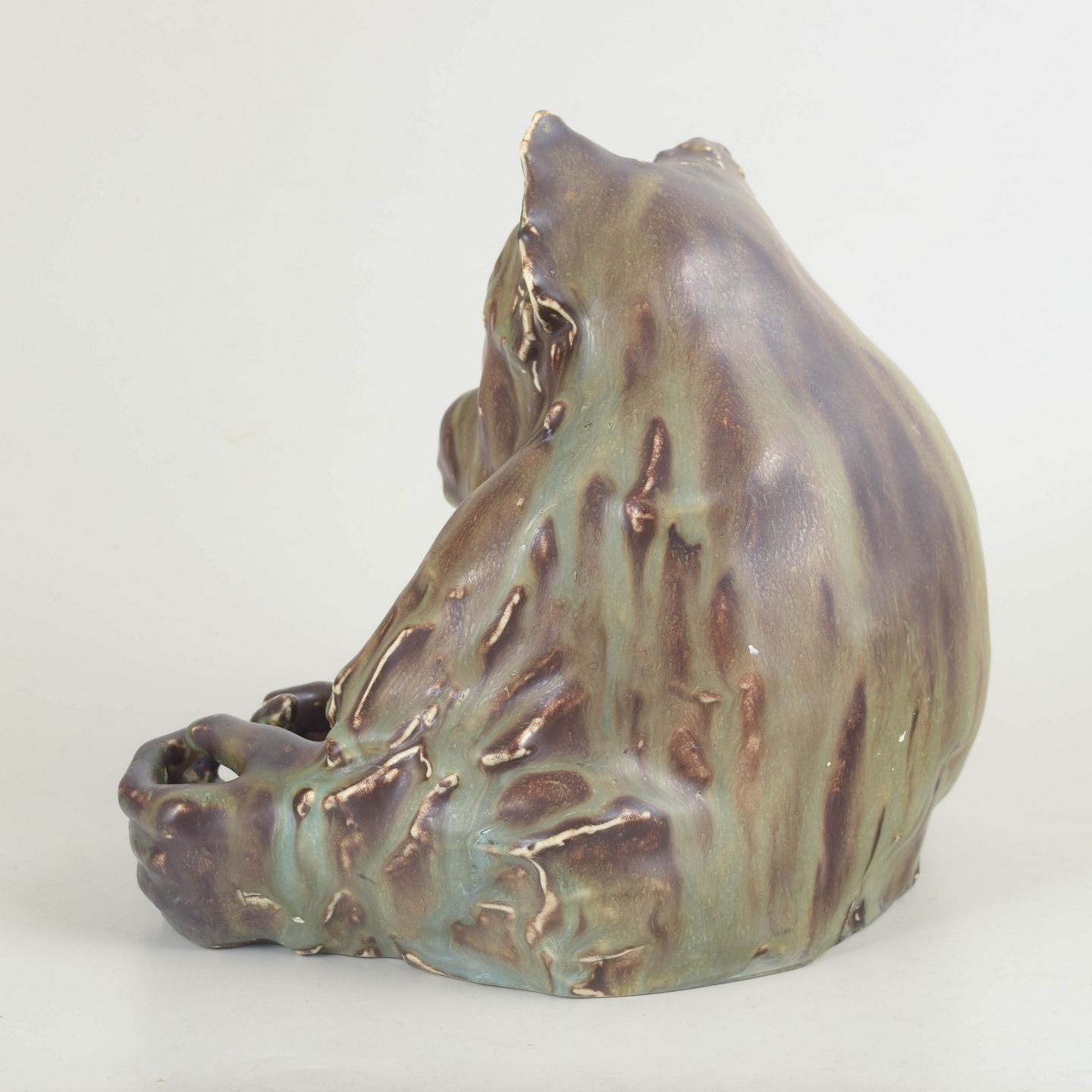 Figurative stoneware sculpture modelled as a seated chimpanzee, characterized by a powerful, sculptural presence and a richly variegated, flowing glaze. A distinctive and rare example of Jean René Gauguin’s animal sculptures produced for Bing & Grøndahl.