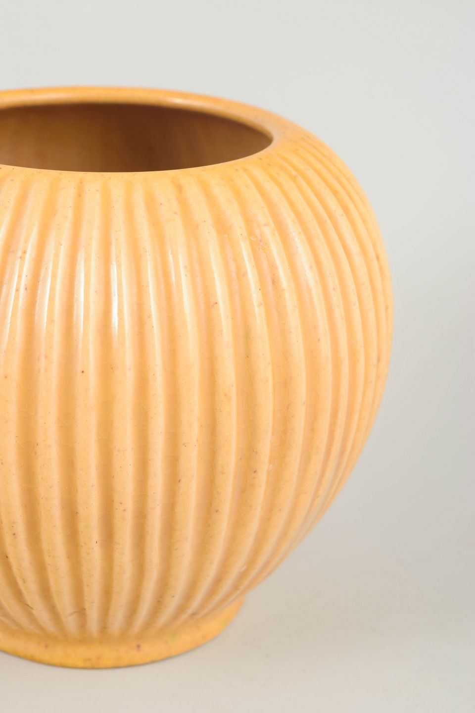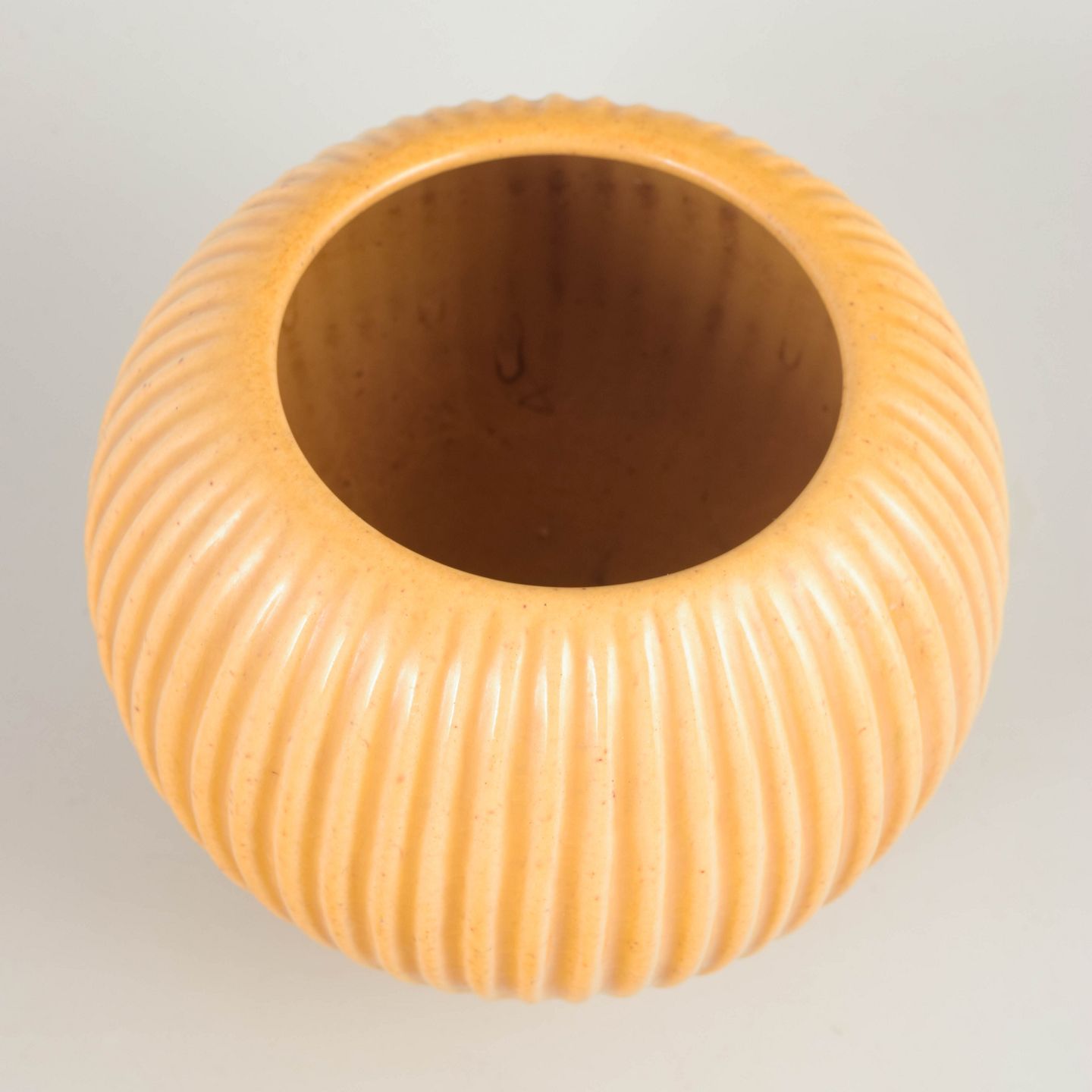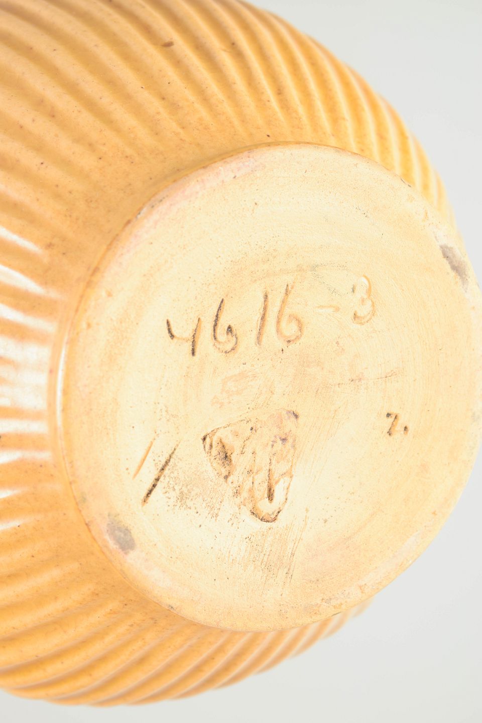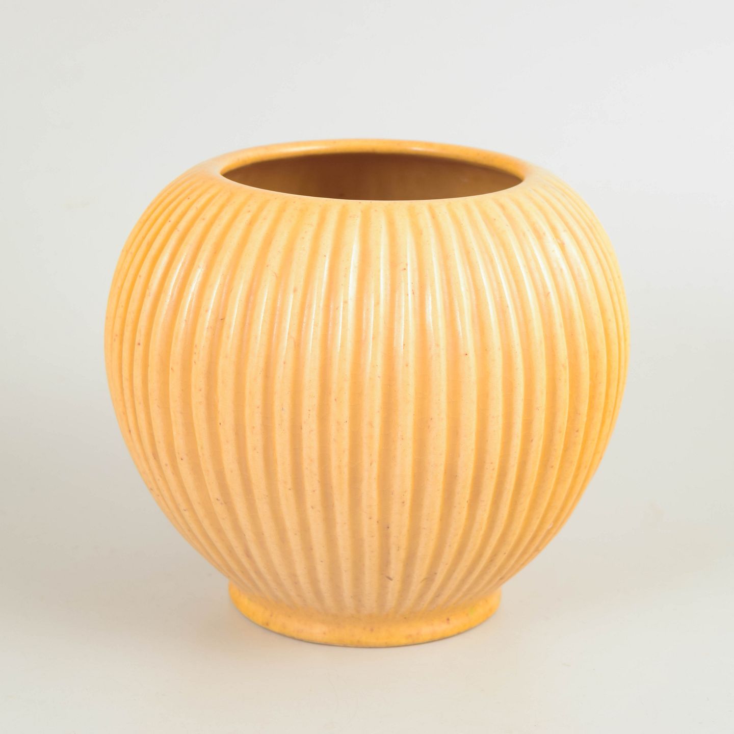Scandinavian studio potter vase, 1940s, Art Deco.Sculptural vase in thrown stoneware with a pronounced vertically ribbed body and a rounded baluster-shaped silhouette. The matte ochre to sand-toned glaze emphasises the strict, geometric character typical of Nordic Art Deco and early modernism. Marked model 4616-3.