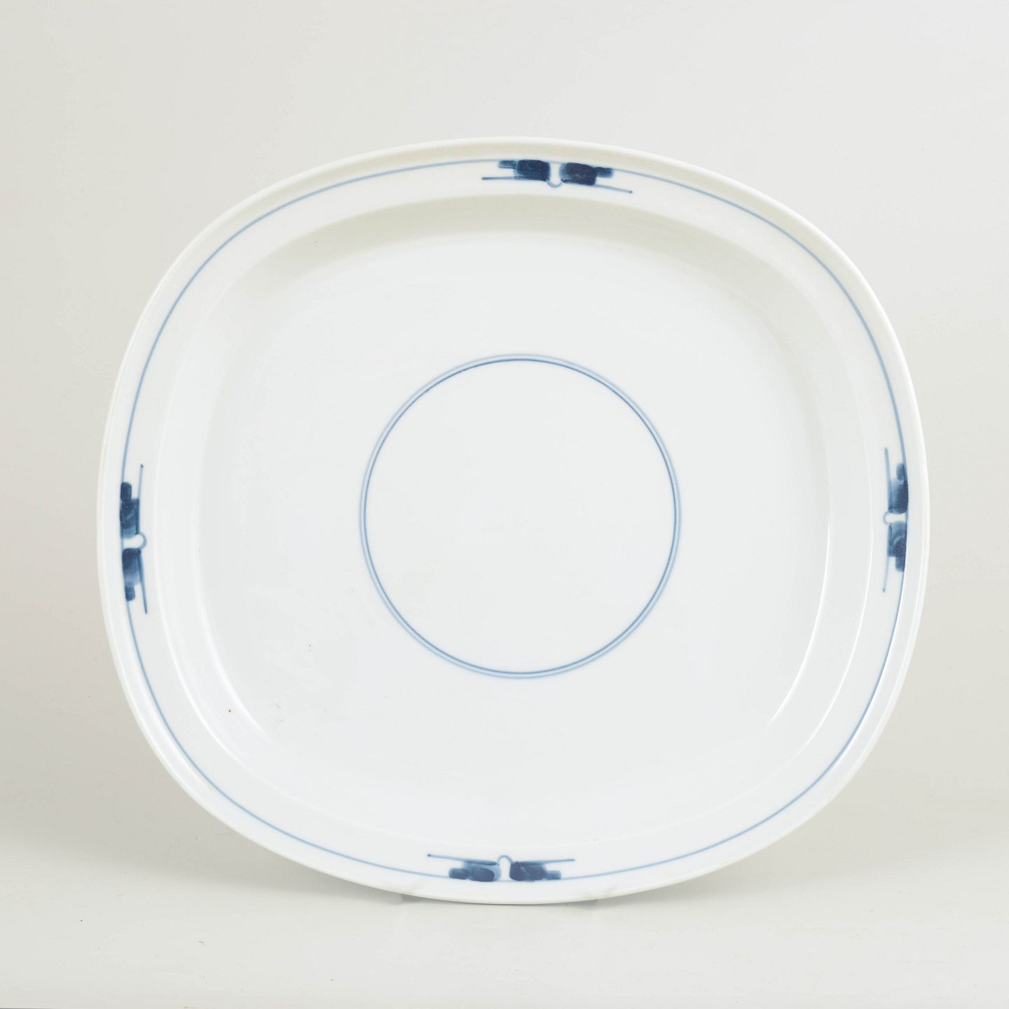 Large serving platter from the Gemina service, produced in white porcelain with a subtle, graphic blue underglaze decoration. The clean, almost architectural form emphasises the service’s modernist character and makes the platter ideal for serving and presentation.