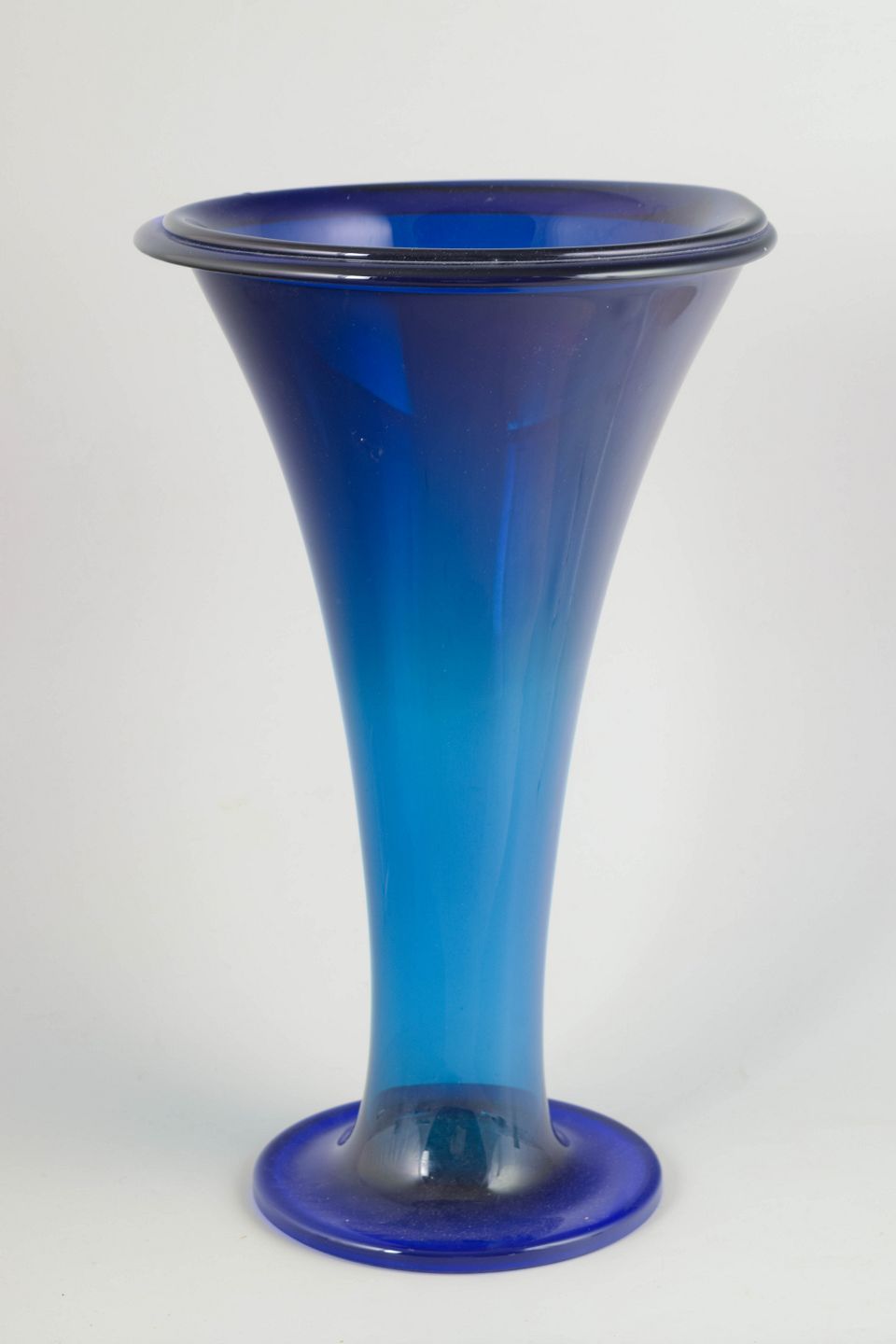 Elegant trumpet-shaped vase in mouth-blown, heavy crystal glass with a deep blue colour graduation. A striking example of Czech Art Deco glass with a solid foot and wide flared rim.