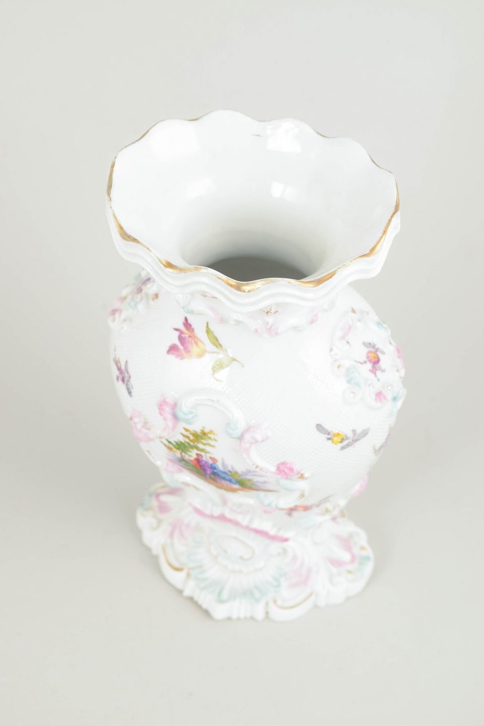 Meissen vase, early 19th century.Rare porcelain vase with rich relief modelling and hand-painted polychrome floral and landscape decoration. Shaped foot and scalloped rim. A fine example of Meissen’s decorative porcelain production from the early 19th century.