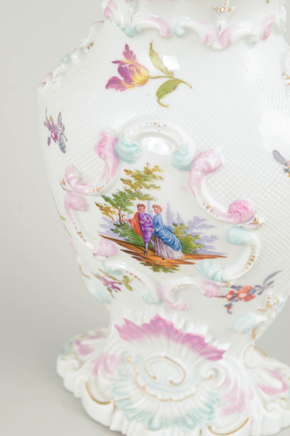 Founded in 1710, Meissen is recognised as Europe’s first porcelain manufactory. During the early 19th century, the factory continued its refined Rococo and late Baroque traditions, producing richly modelled forms with detailed hand-painted decoration.