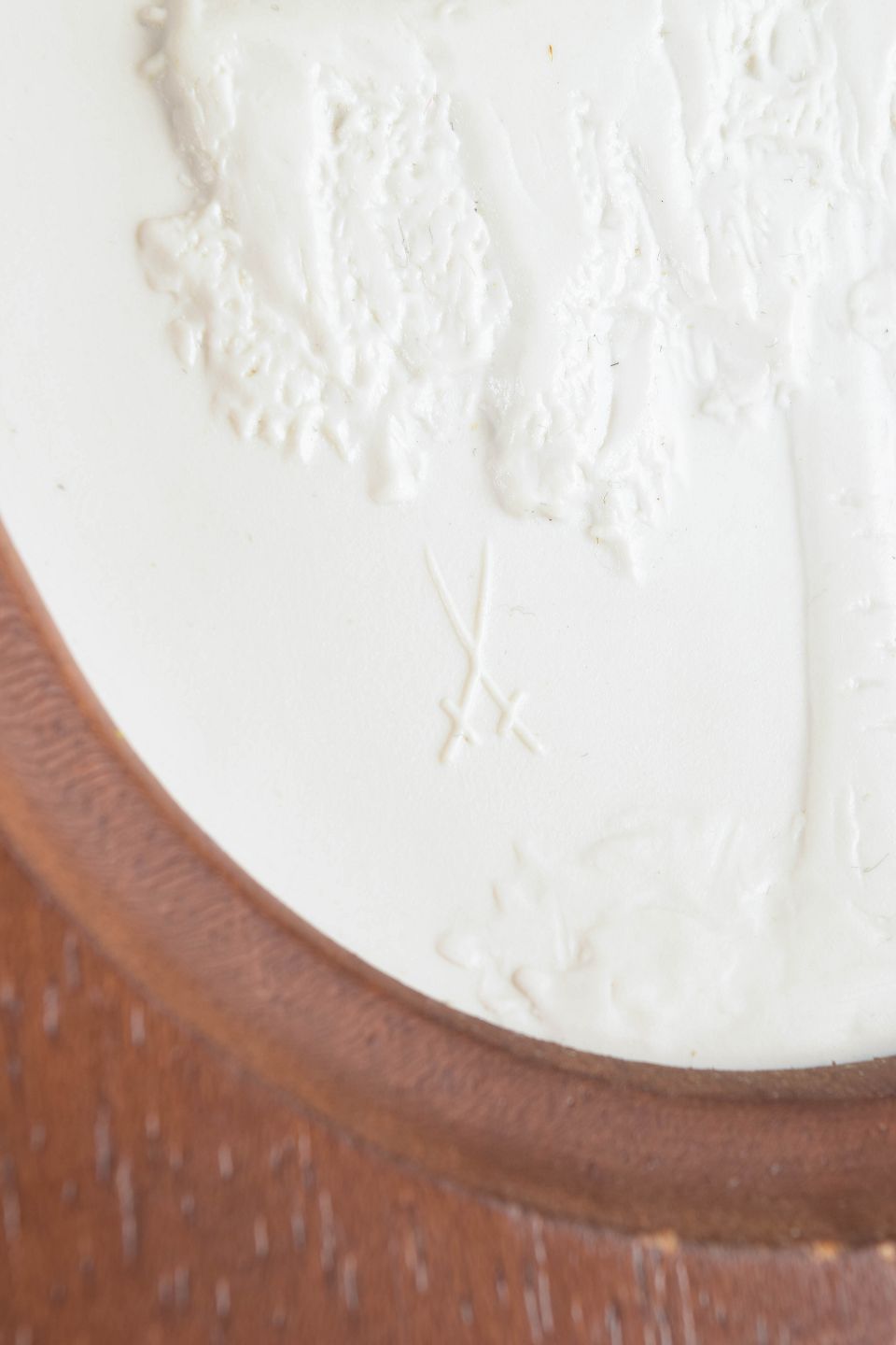 Meissen Biscuit plaque, c. 1970s.Relief plaque in white biscuit porcelain with a naturalistic tree motif, mounted in a rectangular wooden frame with an oval opening. The matte biscuit surface highlights the fine details of the relief, giving the piece a calm and classical appearance.