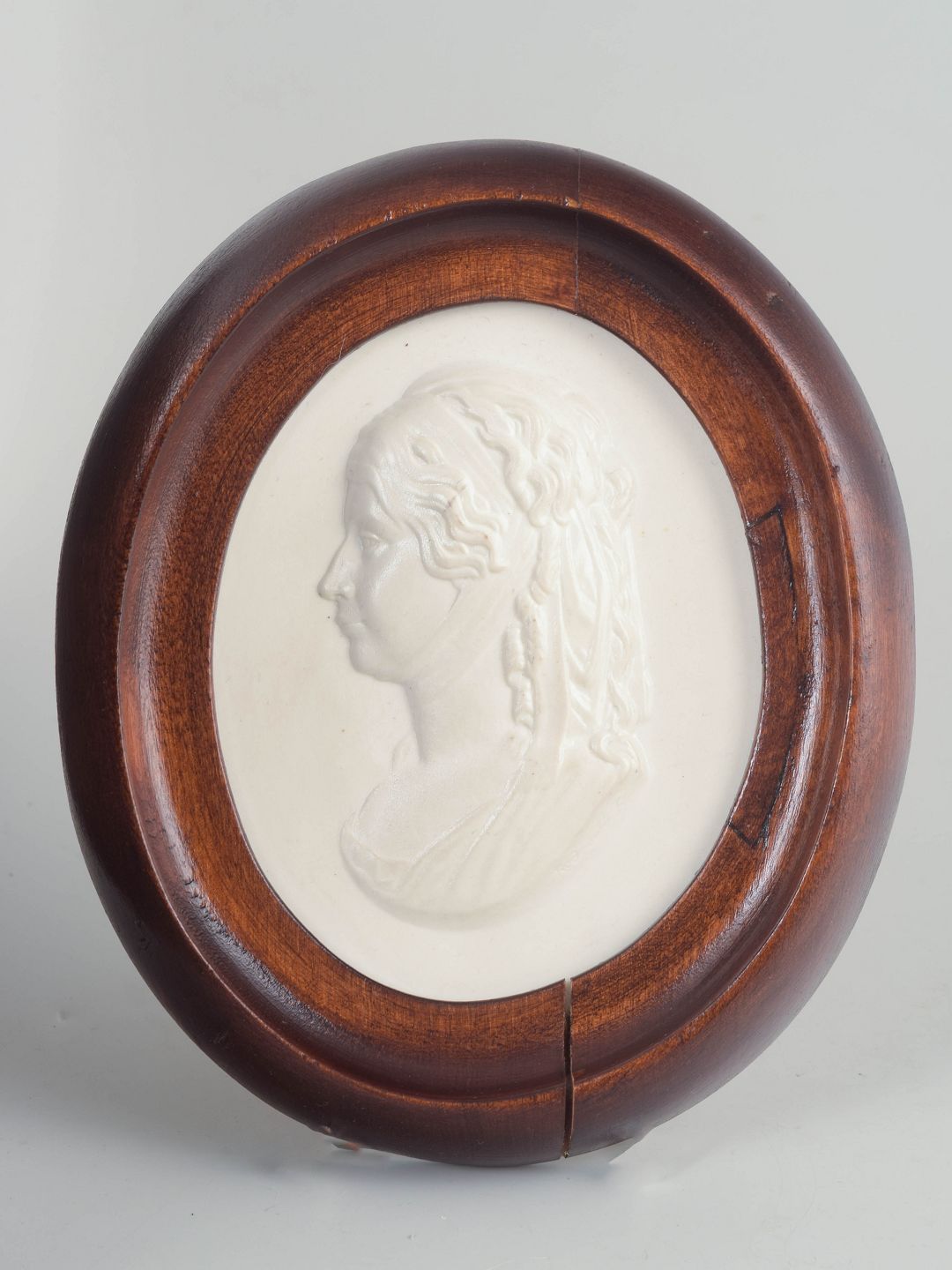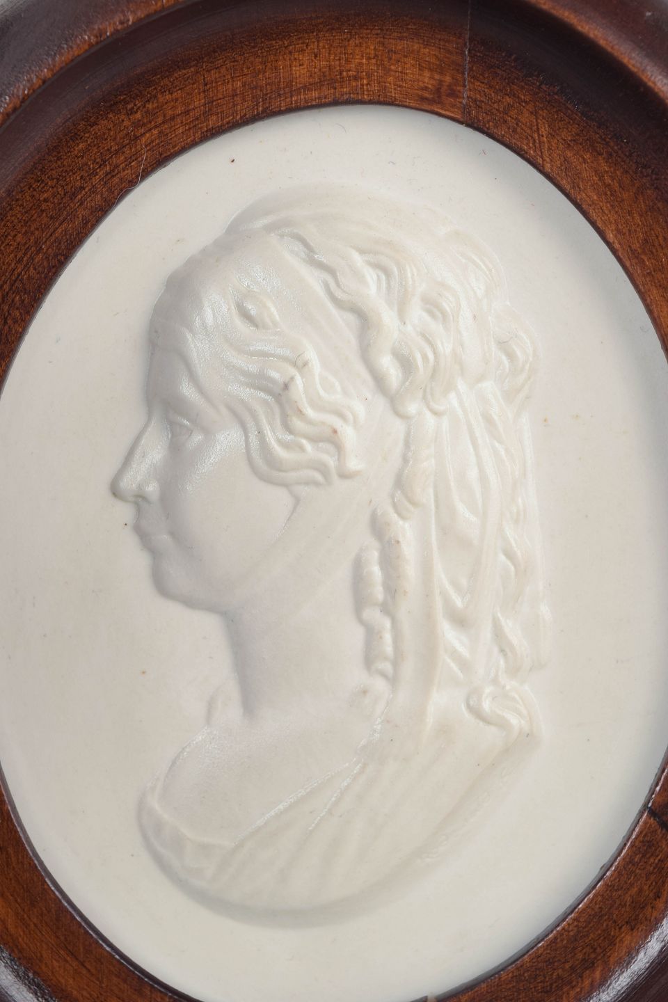 Oval relief plaque in white biscuit porcelain with a classical female profile portrait, mounted in a moulded oval wooden frame. The matte biscuit surface lends the piece a sculptural, cameo-like character with finely rendered details.