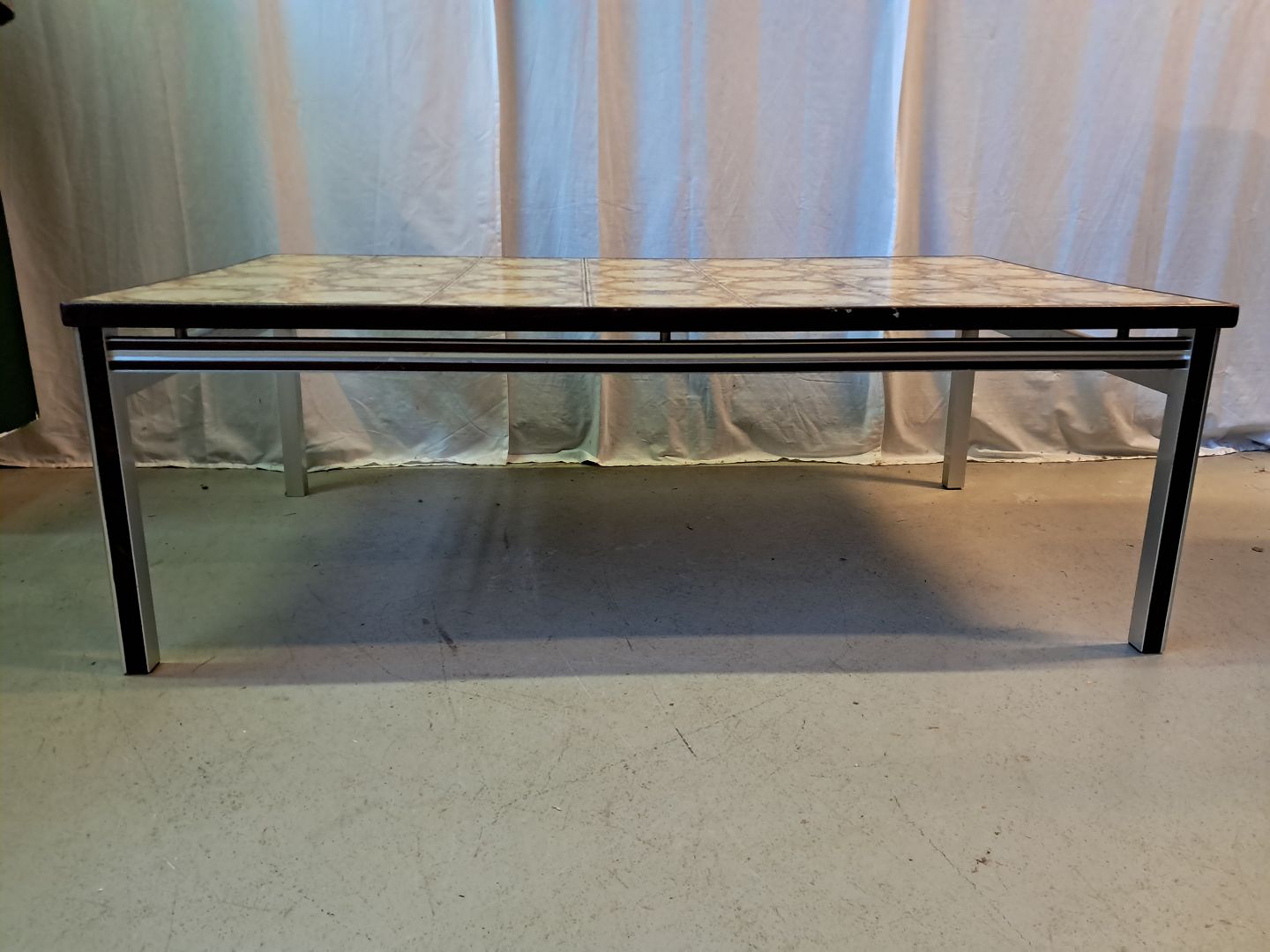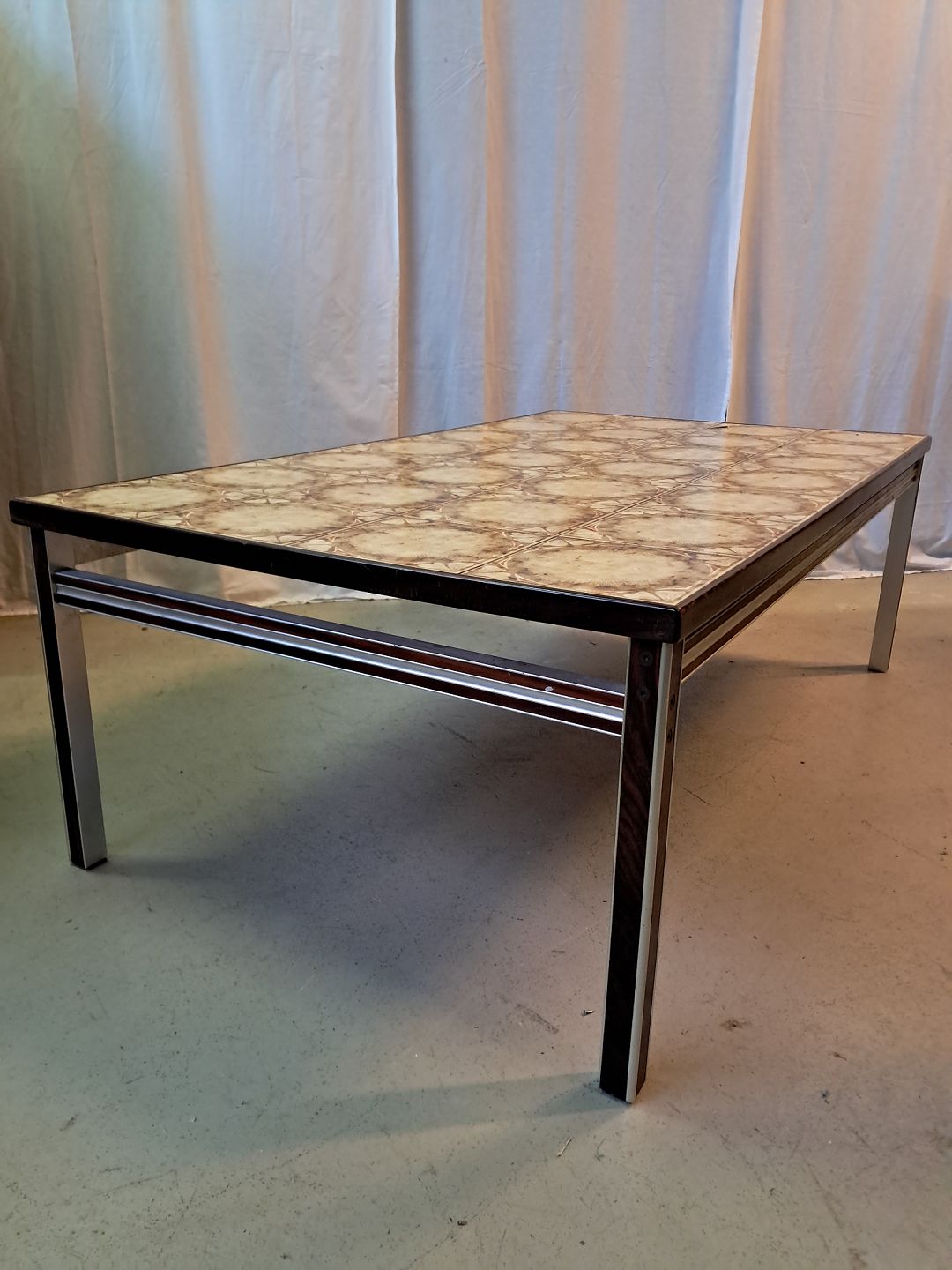Sofabord i fineret palisander og metal med kakler, fra 1960erne.Det har brugsspor.