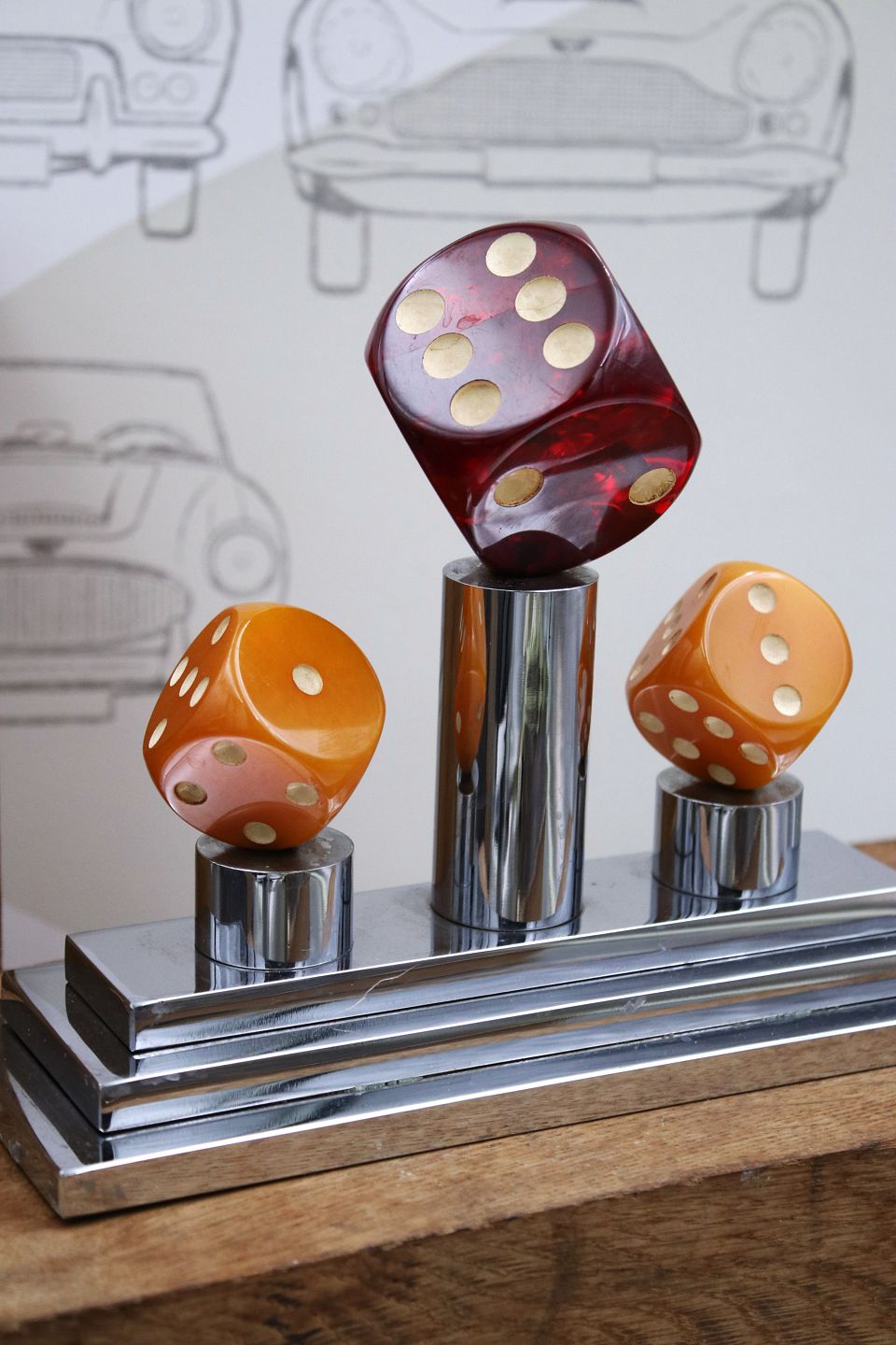 Decorative, old game trophy in chrome with 3 large dice in colored acrylic. H: 17cm. L&W: 21x8cm. (Weighs 3.5 kg.)Item number: Spille pokal