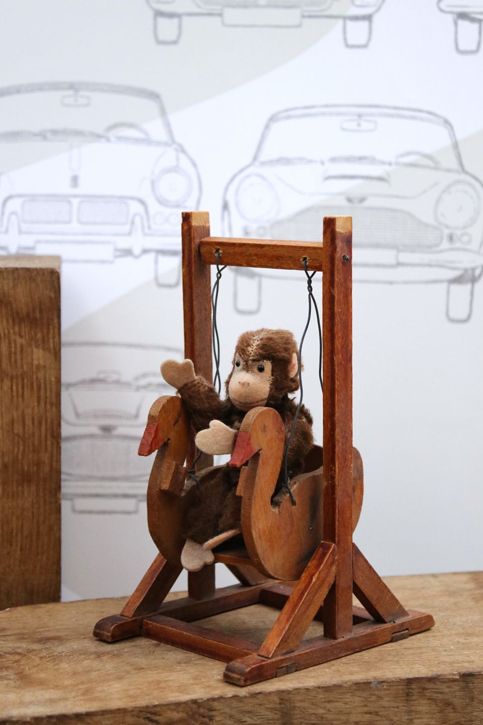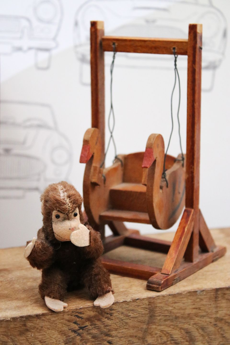 Cute, small plush monkey sitting in an old wooden swing.Swing H: 18.5cm. 12x9cm. Monkey H: 11cm.