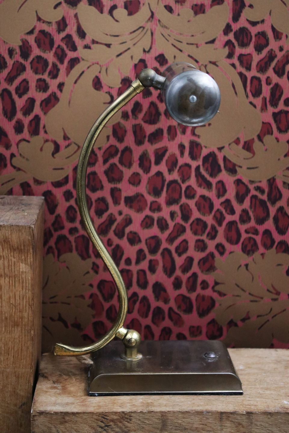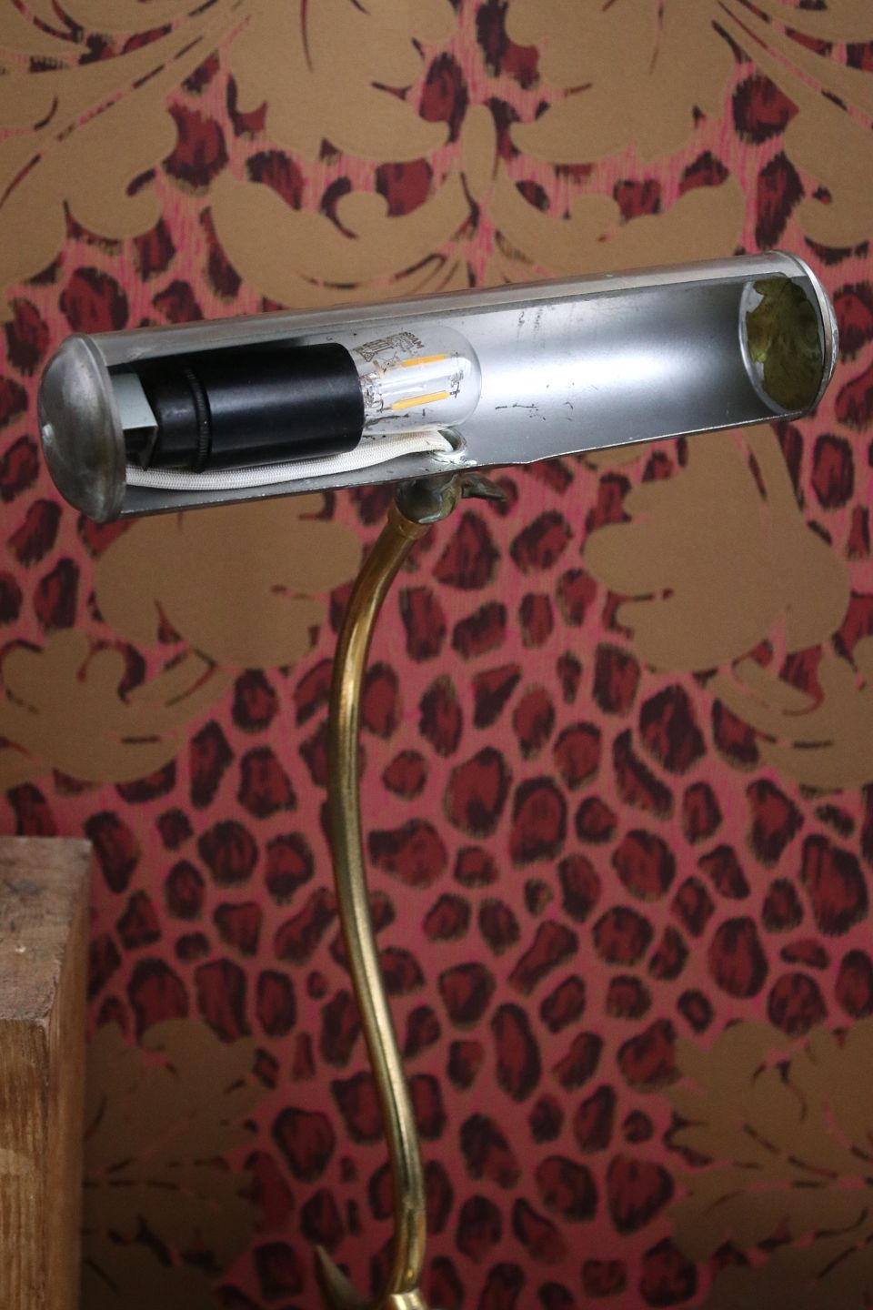 Old desk lamp in patinated brass.H: 31cm. Shade Dia.: L: 20.5cm. Dia.: 4.5cm.