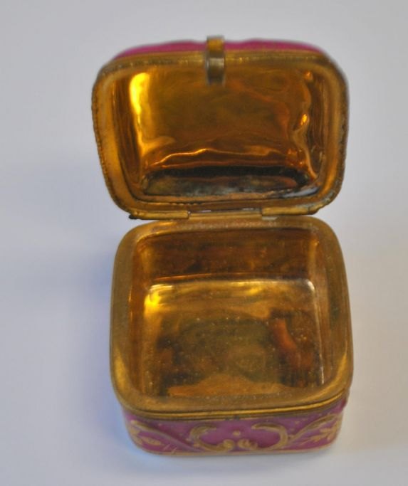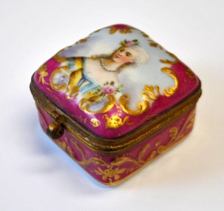 Sevres porcelain pill box, 19th century. France. Hand-painted porcelain with rococo woman. Light red with rococo gilding. Gilded inside. 4.5 x 4.5 x 3 cm. Perfect condition!Item number: 28719