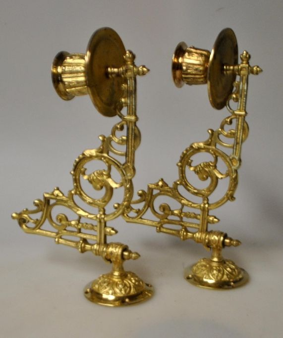 Pair of brass piano candlesticks, 19th century. With decorations of masquerades. L: 19.5 cm.Perfect condition. Freshly polished!
