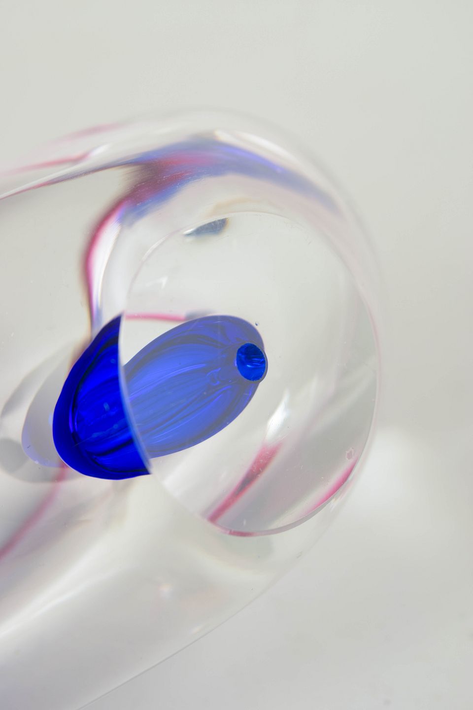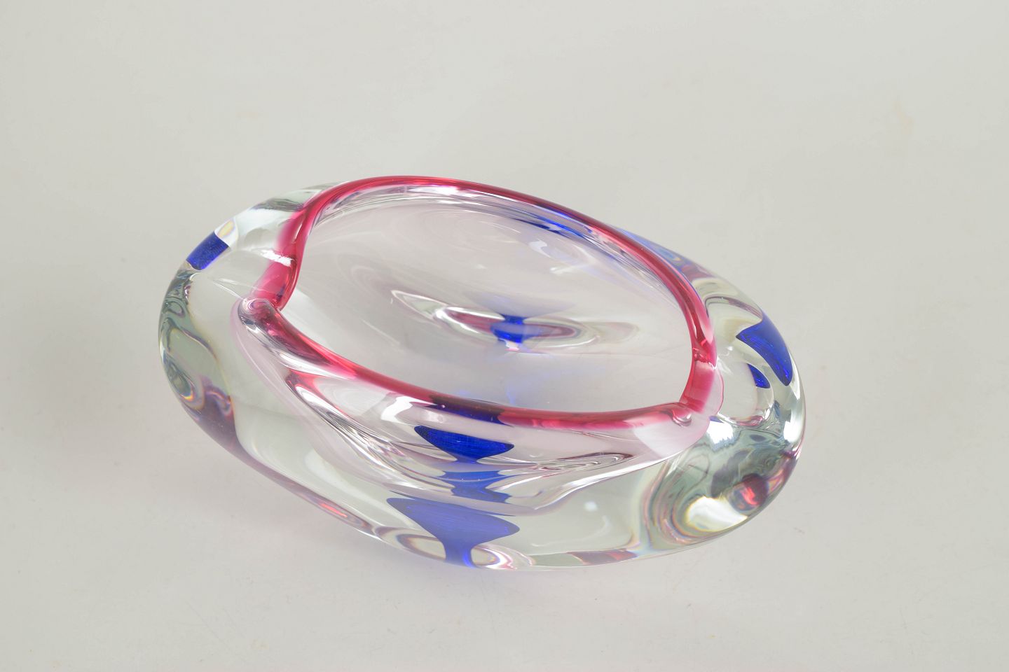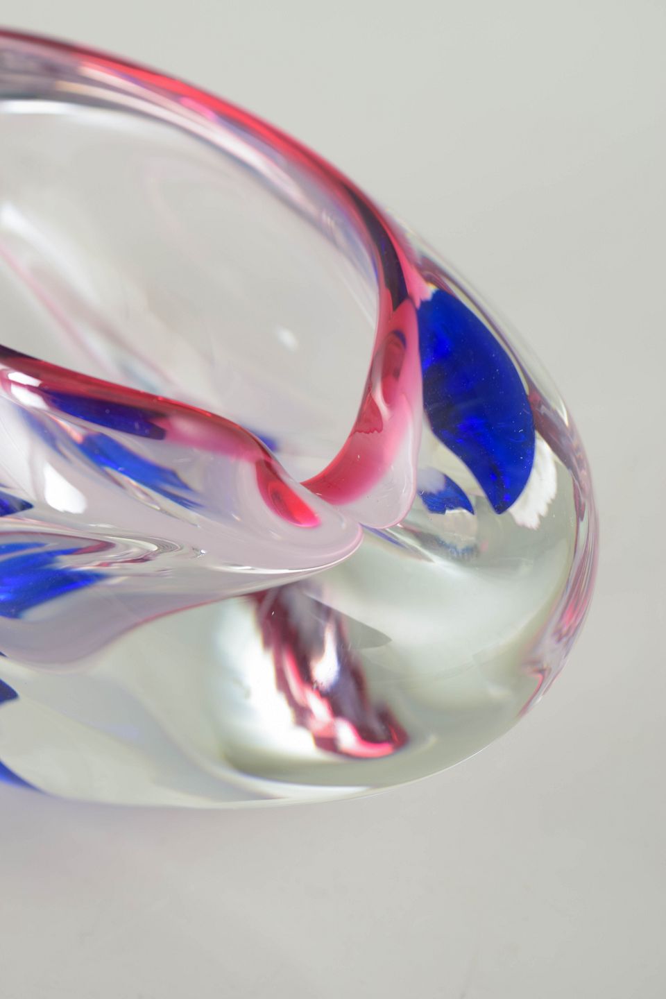 Murano, sommerso glass bowl.Organic-shaped bowl in mouth-blown art glass using the layered sommerso technique. Clear glass with encased blue and pink colour fields, creating depth and a distinctive floating play of colour. Typical Murano work from the 1960s/70s with soft, sculptural lines.