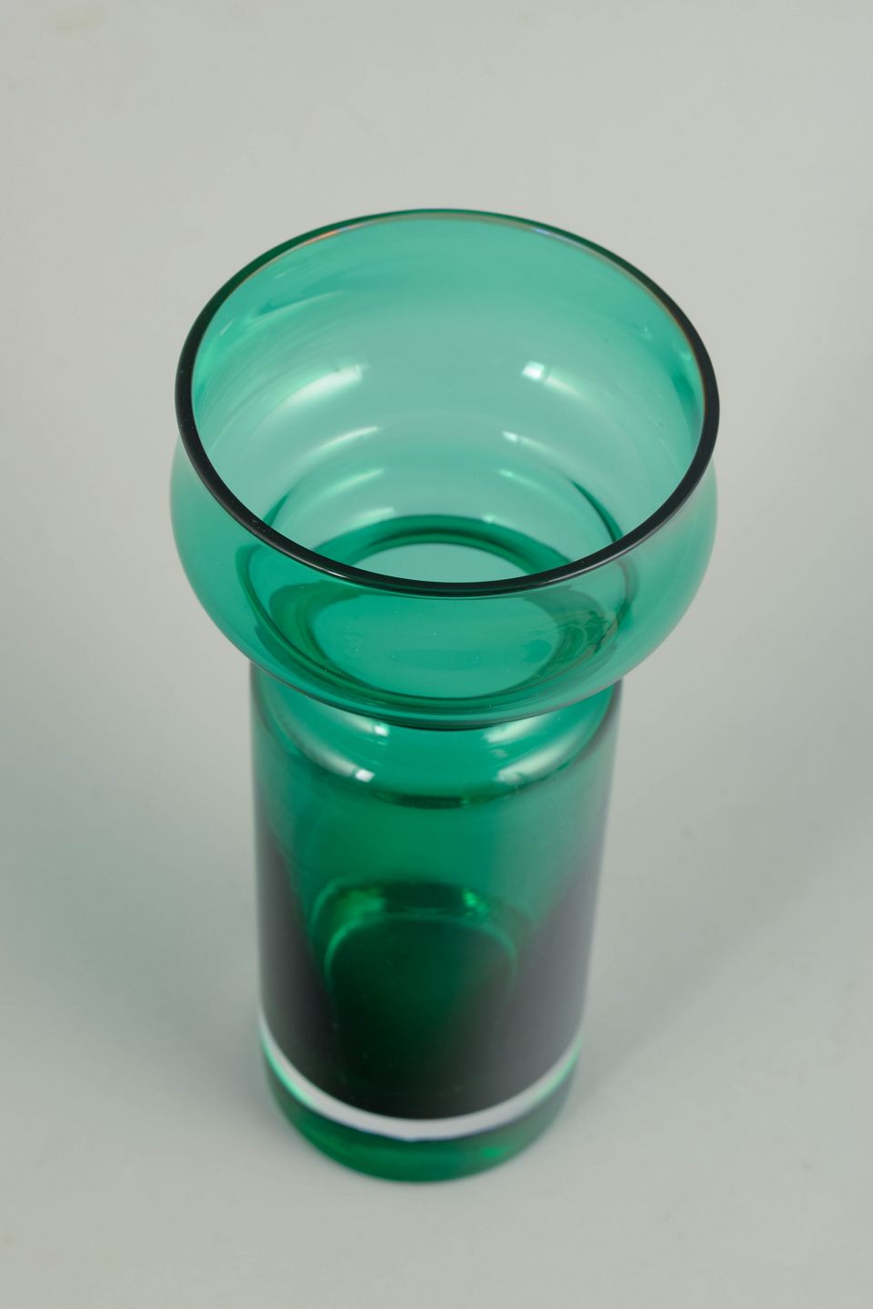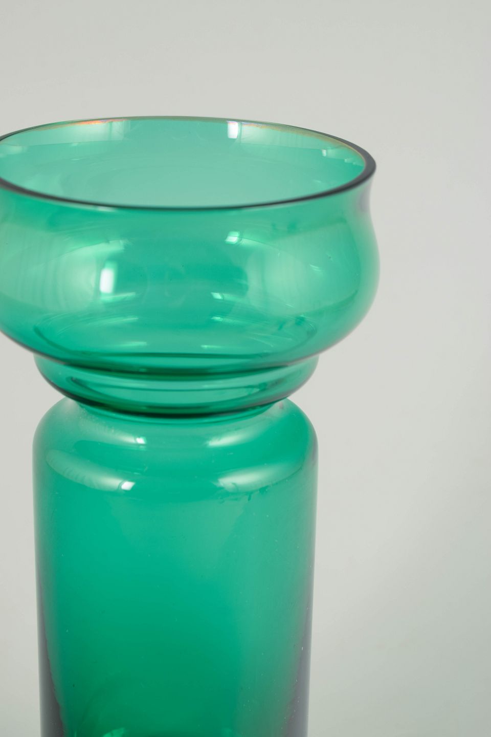Tamara Aladin for Riihimäen Lasi, mouth-blown art glass vase.An elegant vase in clear turquoise-green glass with a balanced, sculptural profile and softly rounded form. Mouth-blown with a pronounced bowl-shaped upper section and cylindrical lower body, characteristic of Finnish art glass from the 1970s.