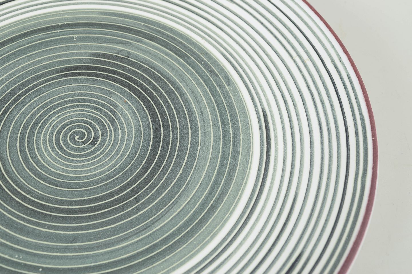 Hjördis Oldfors for Upsala-Ekeby, dish.Decorative glazed ceramic dish with a graphic spiral motif in grey-green tones and a red rim. The piece presents a clean, period-correct Swedish modernist expression from the 1930s/40s, noted as model 53.