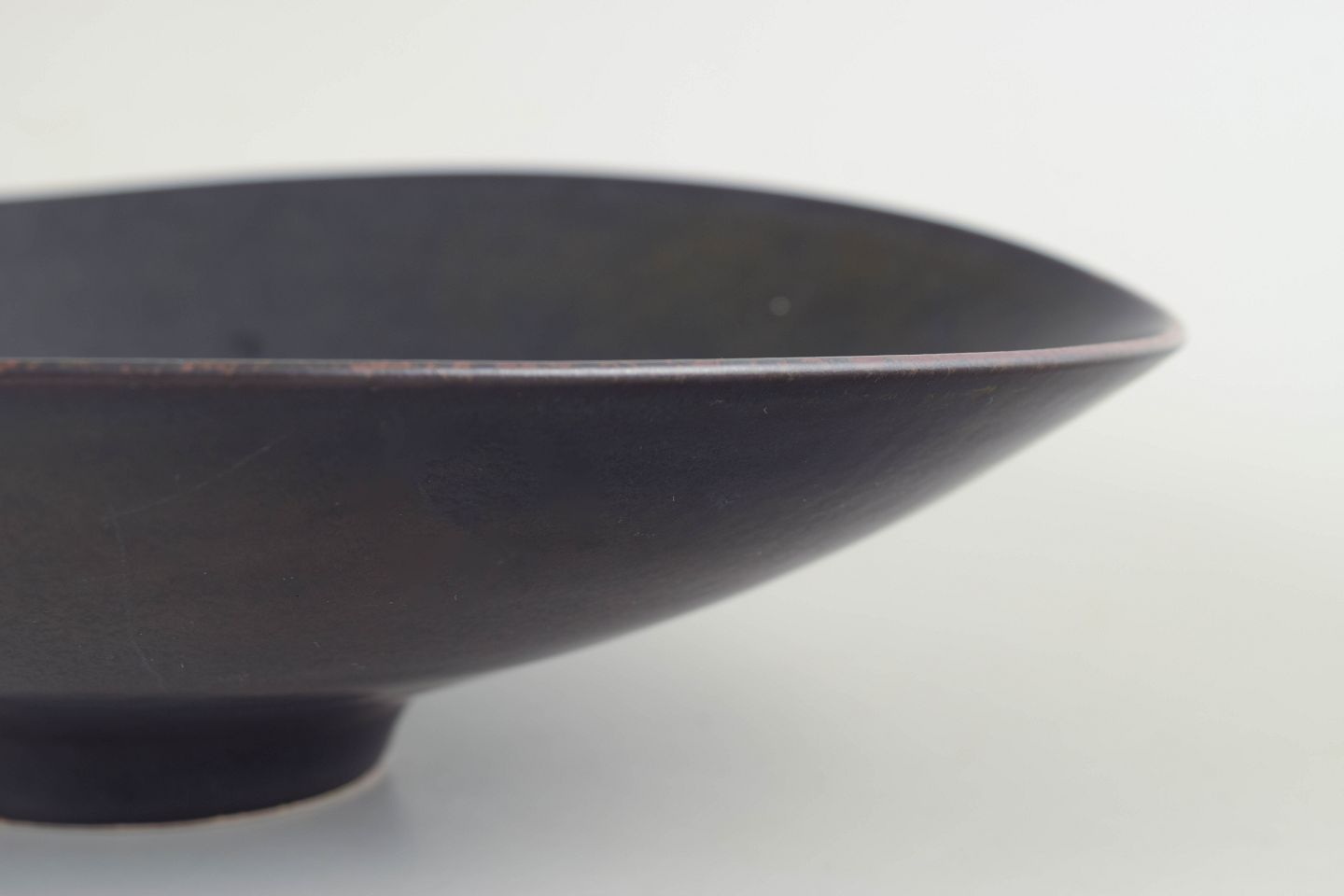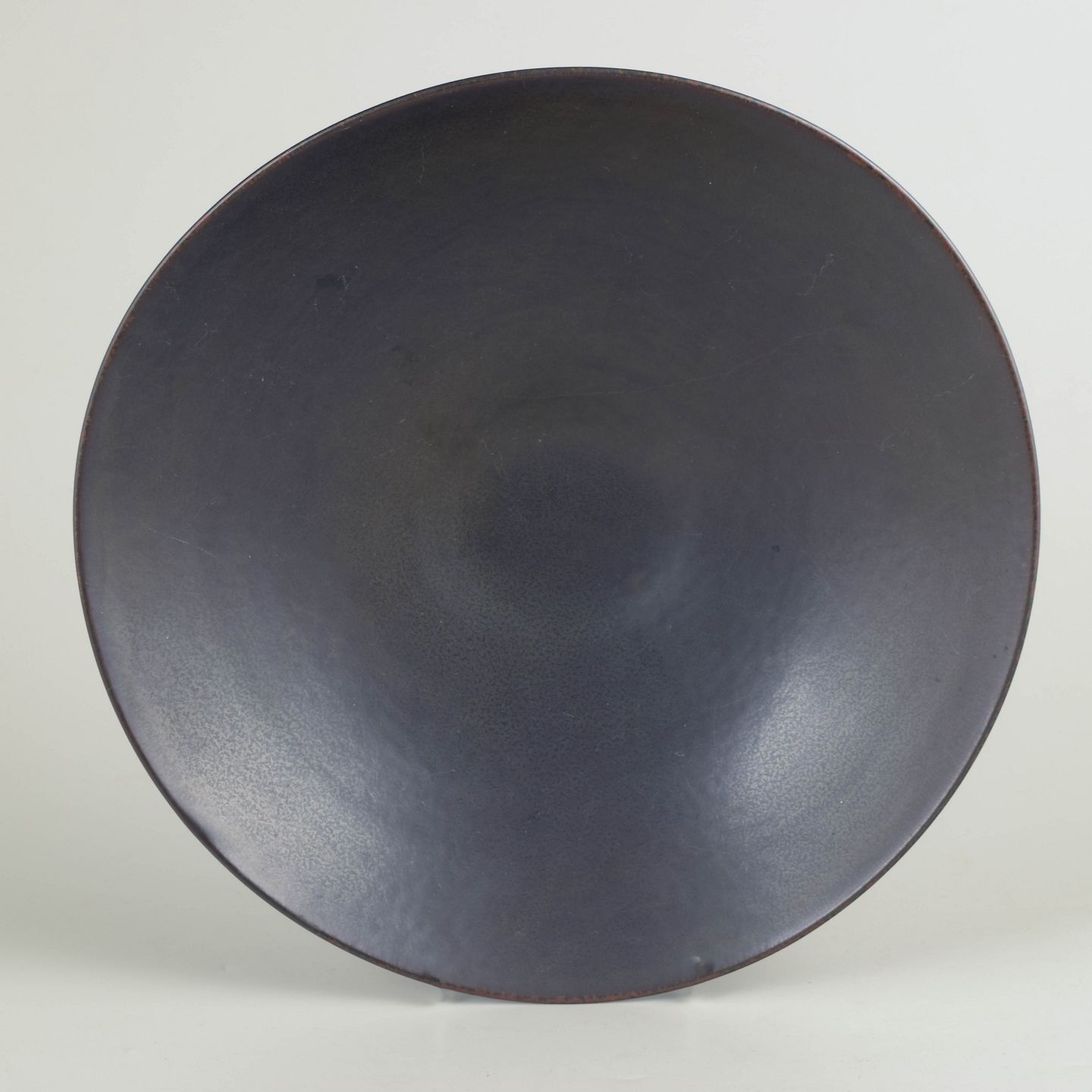 Carl-Harry Stålhane for Rörstrand, large bowl.Large, low stoneware bowl with a wide, open profile and a subtly raised foot. Finished in a restrained dark glaze with a matte surface that accentuates the clean silhouette and confident proportions. A characteristic example of Carl-Harry Stålhane’s modernist approach at Rörstrand in the mid-20th century, emphasizing material quality and formal clarity.