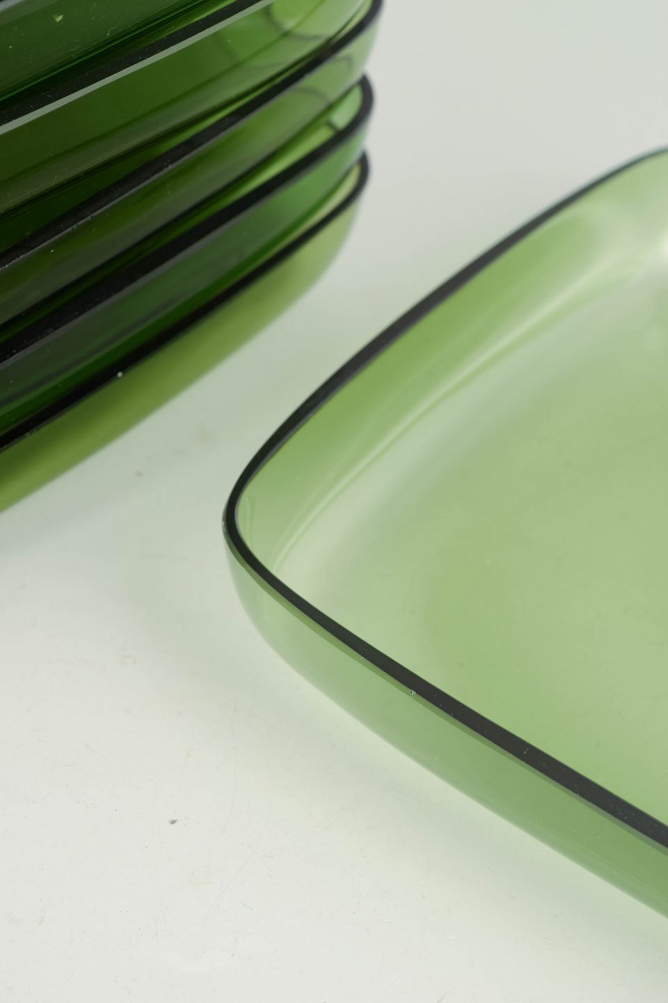Set of 6 Swedish Glass Plates.Set comprising six handmade green glass plates with softly rounded corners and a gently raised rim. A restrained and functional design with a clear Scandinavian modernist expression.