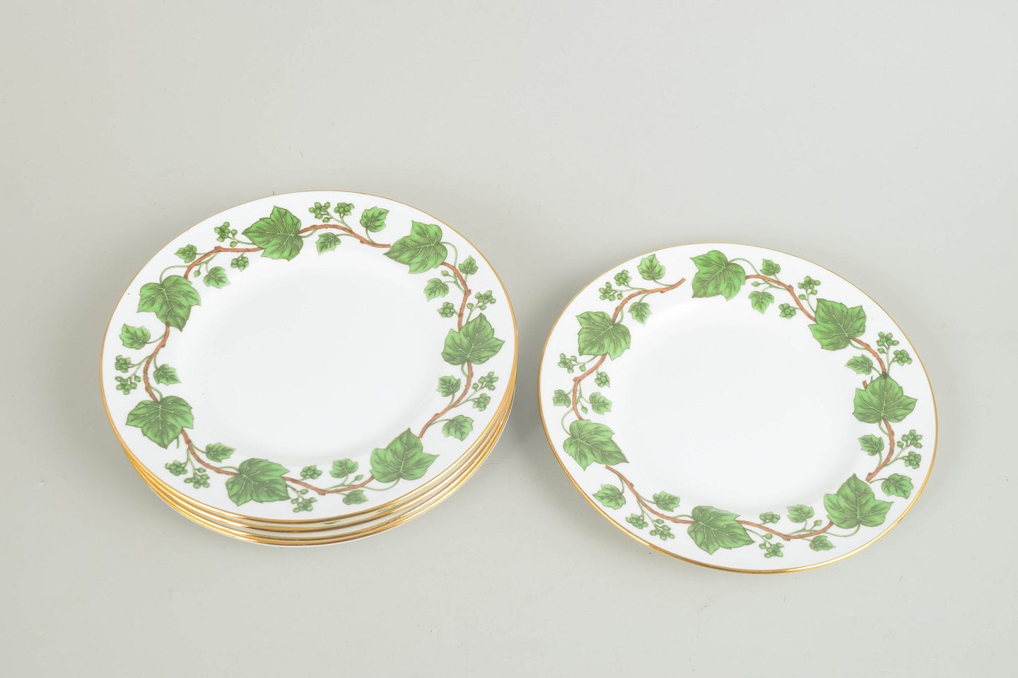 Staffordshire, England, Ivy series, set of five plates.Decorative faience plates with green ivy decoration and gilt rim, produced in Staffordshire, England.