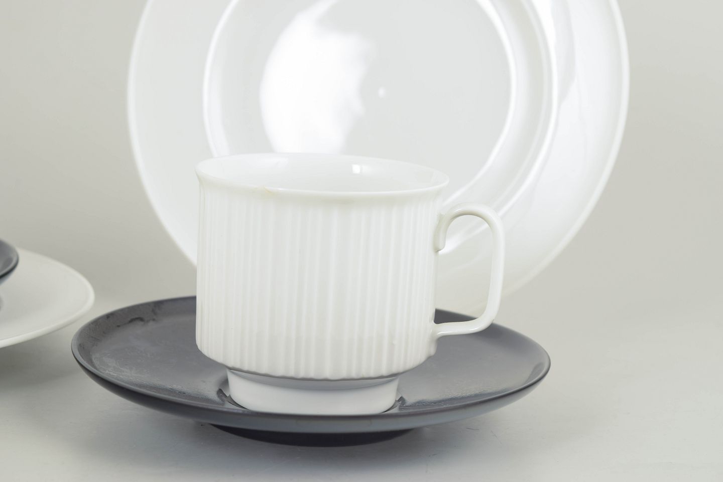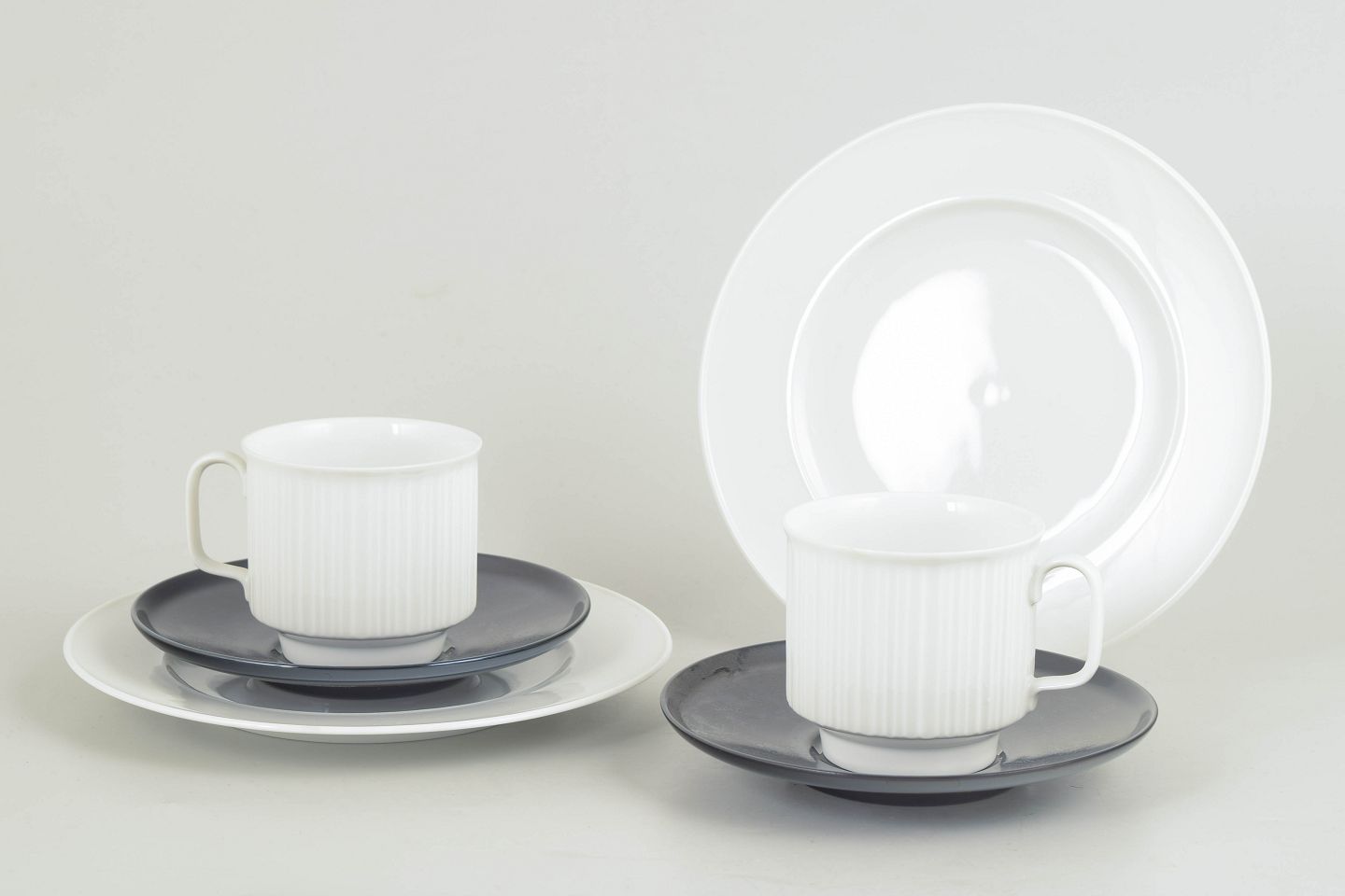 Tapio Wirkkala for Rosenthal, set of two coffee cups with matching saucers and cake plates.Set comprising two coffee cups in white porcelain with a distinctive fluted surface, each with a matching saucer in a contrasting glaze, accompanied by two matching cake plates. A restrained and functional design with a clear Nordic modernist expression.