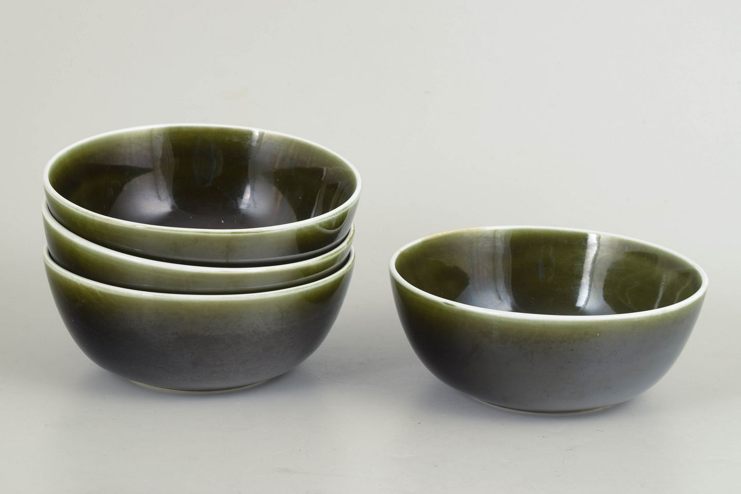 Stig Lindberg for Gustavsberg, Vardag series, set of four bowls.Set of four stoneware bowls from the Vardag series with a characteristic green glaze. Simple, functional forms designed for everyday use, expressed in a calm and timeless Scandinavian modernist style.