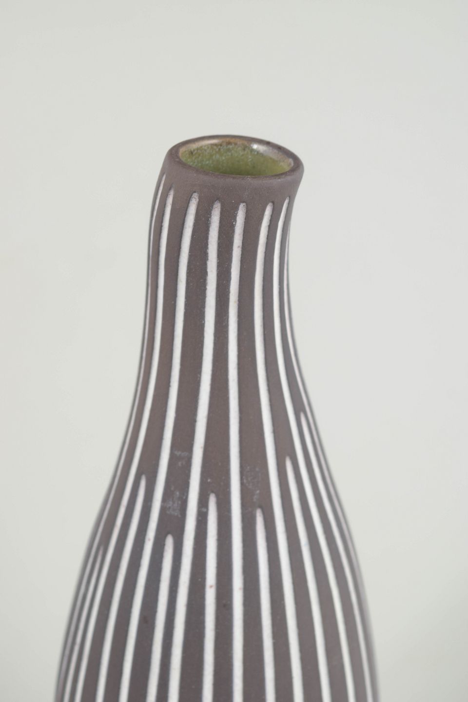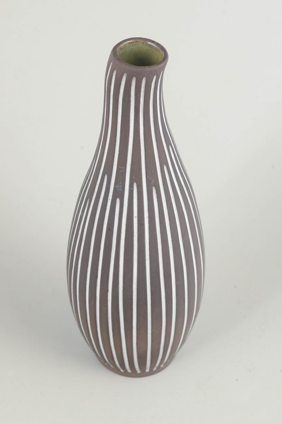 Slender, elongated stoneware vase with characteristic hand-painted white striped décor on a dark brown body. An elegant example of Nordic modernist design.
