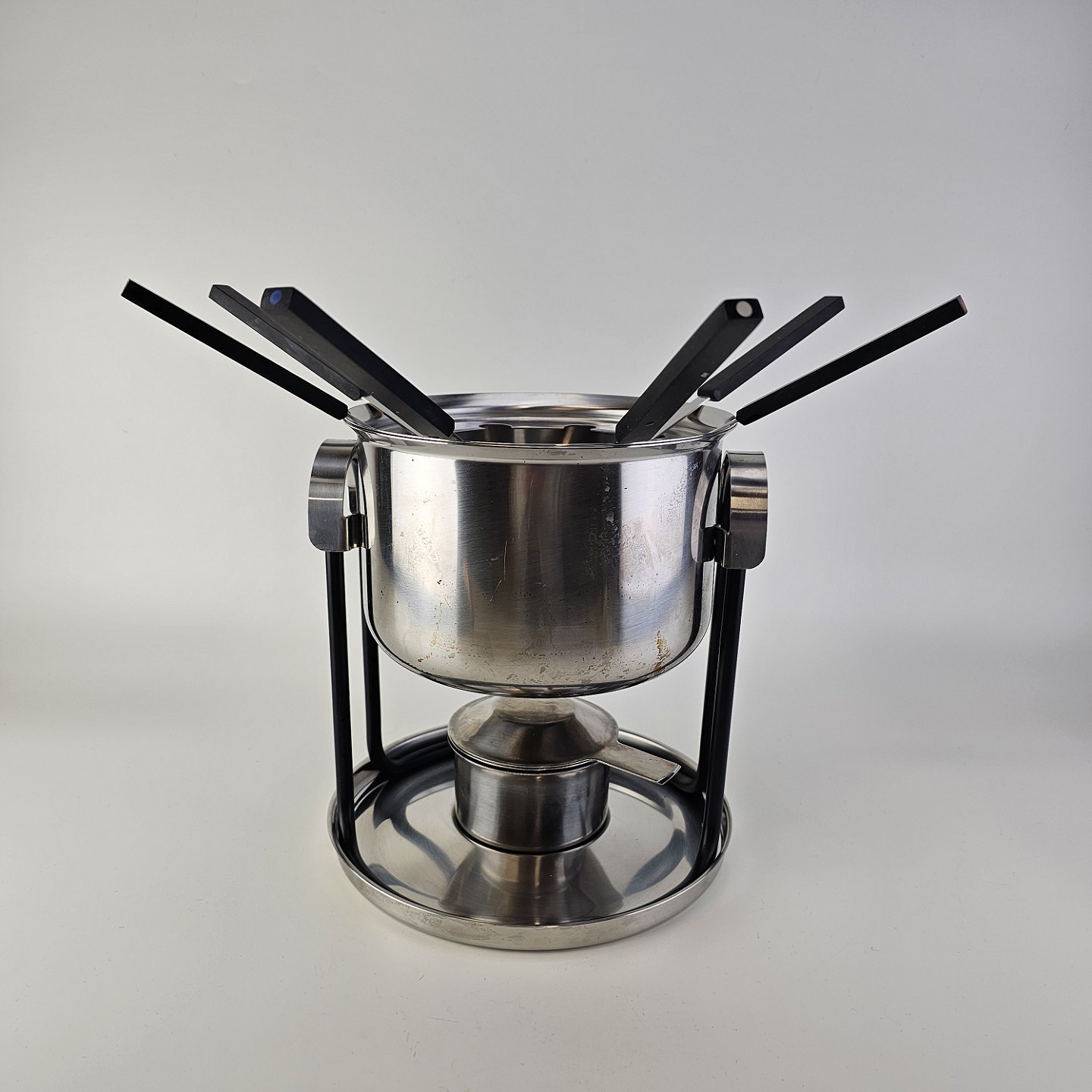 Stelton fonduesæt i rustfrit stål inklusiv stander, brænder, gryde og seks fondue gaflerProducent Stelton
