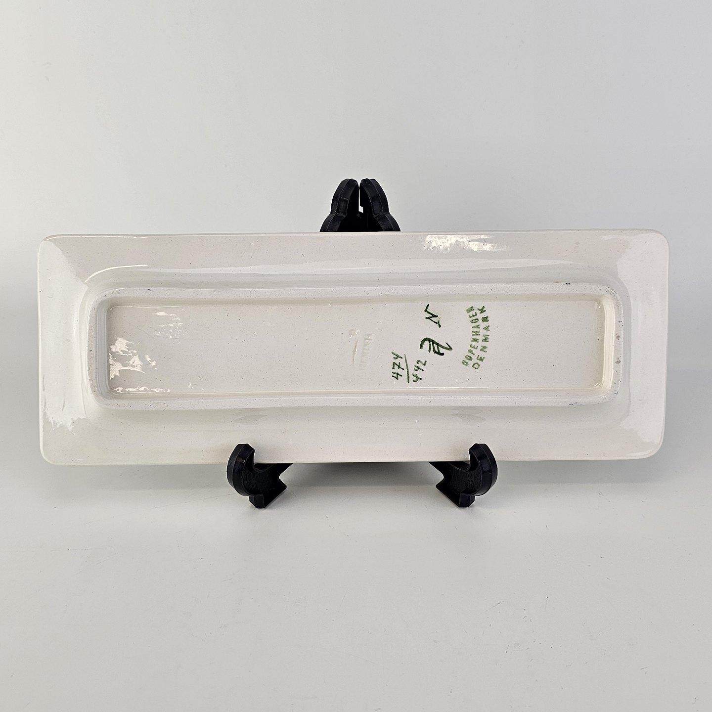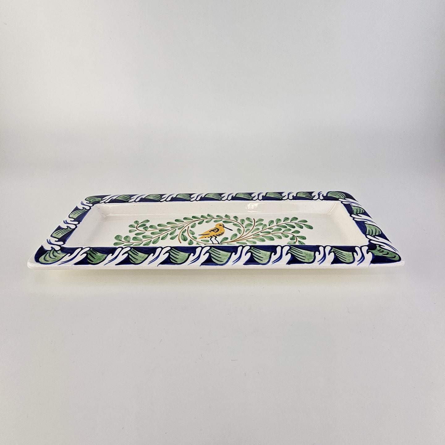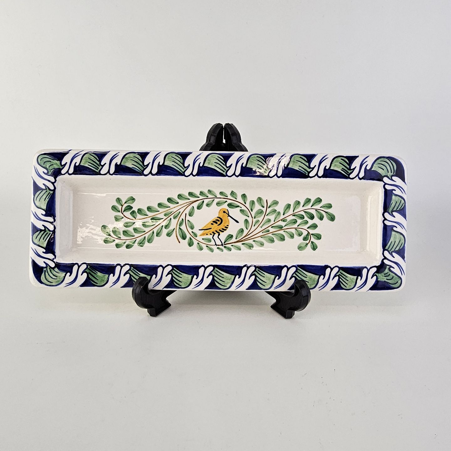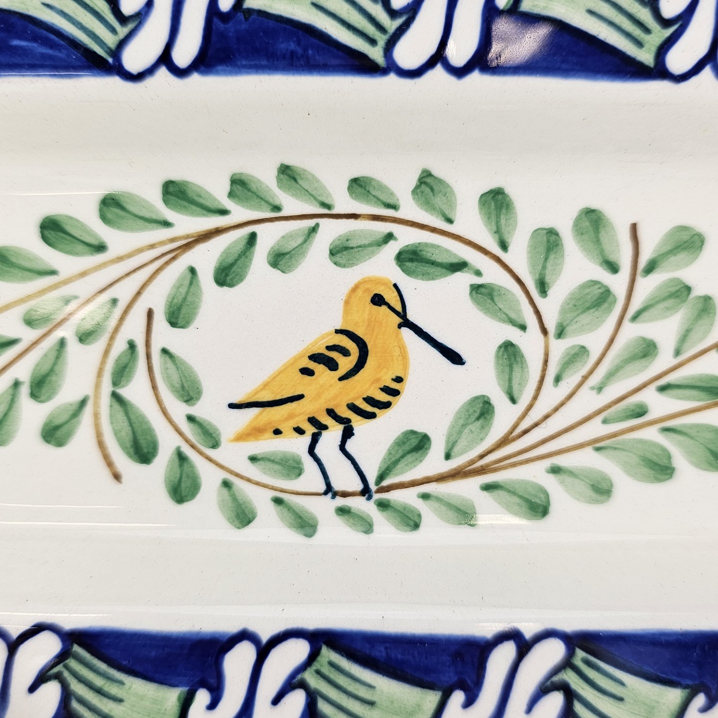 Pennebakke i fajance med dekoration af en gul fugl, blade og blå kant med blomster, flot stand.474/442