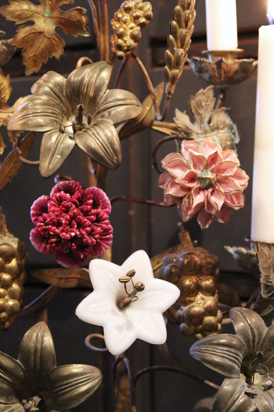 Antique French church candlestick in bronze with a fine dark patina.The candlestick has space for 7 candles and is decorated with 2 fine colored porcelain flowers, 1 white opal glass flower, bunches of grapes, ears of corn, vine leaves and large lily flowers in bronze.