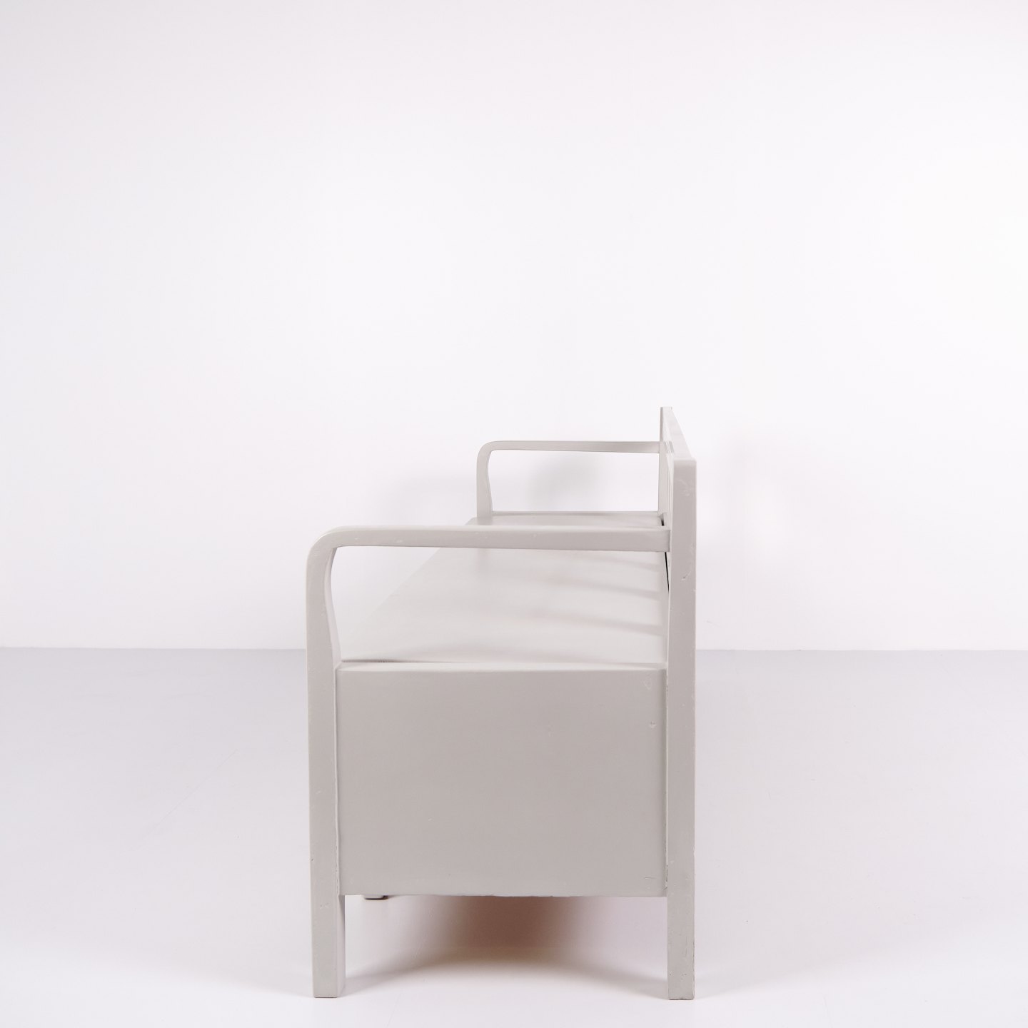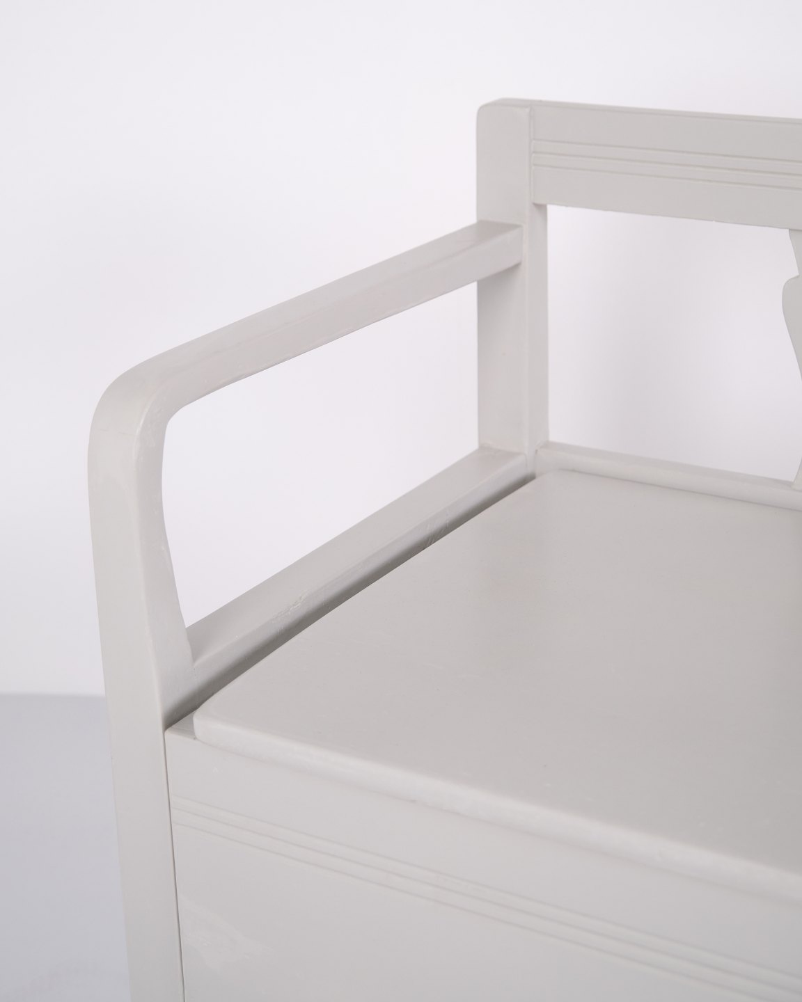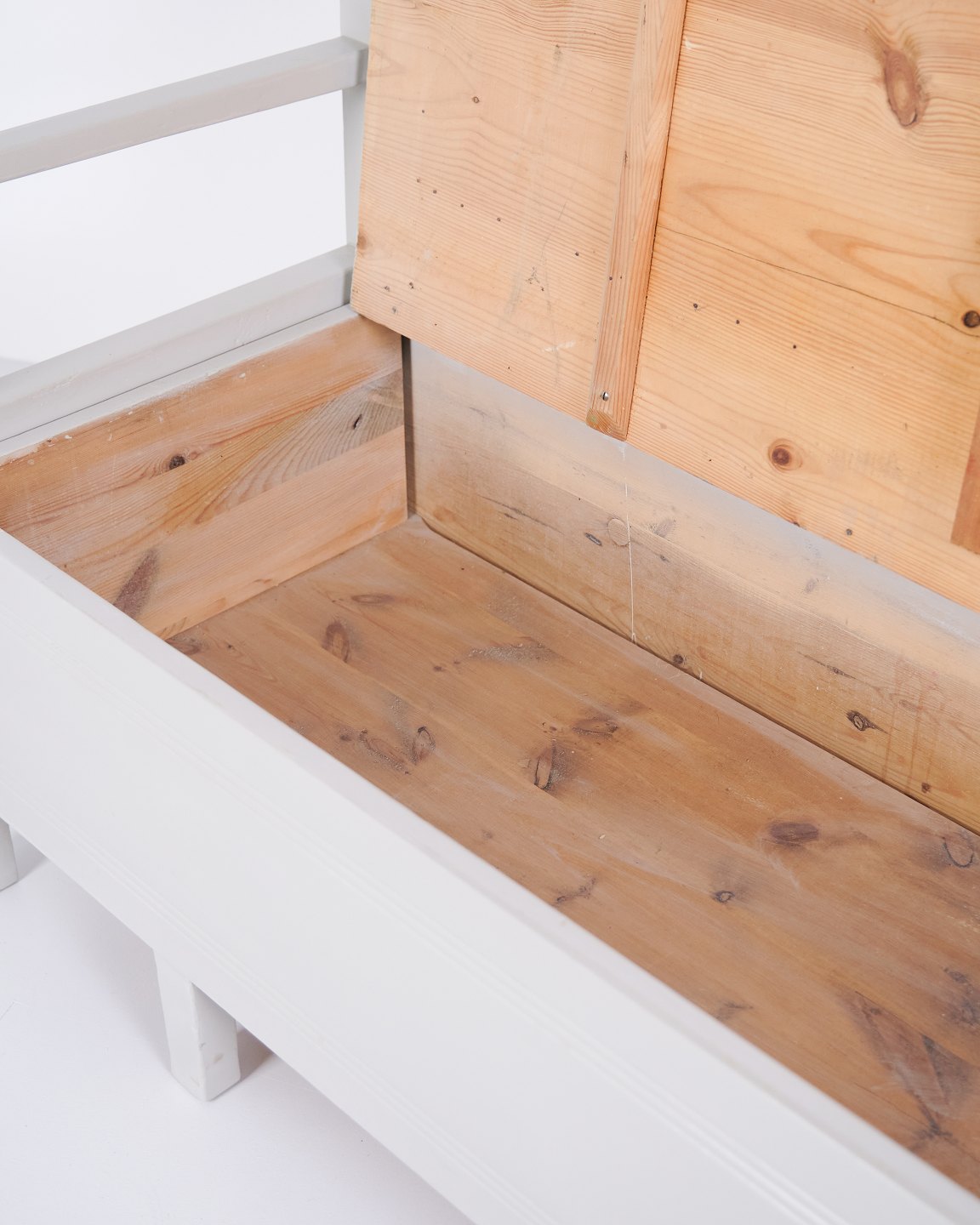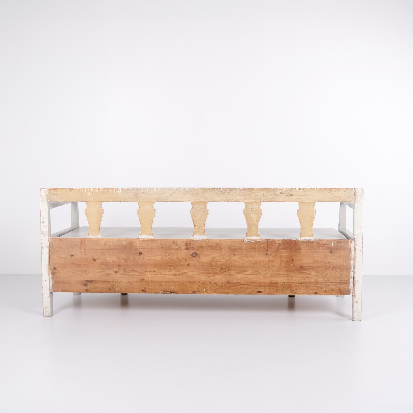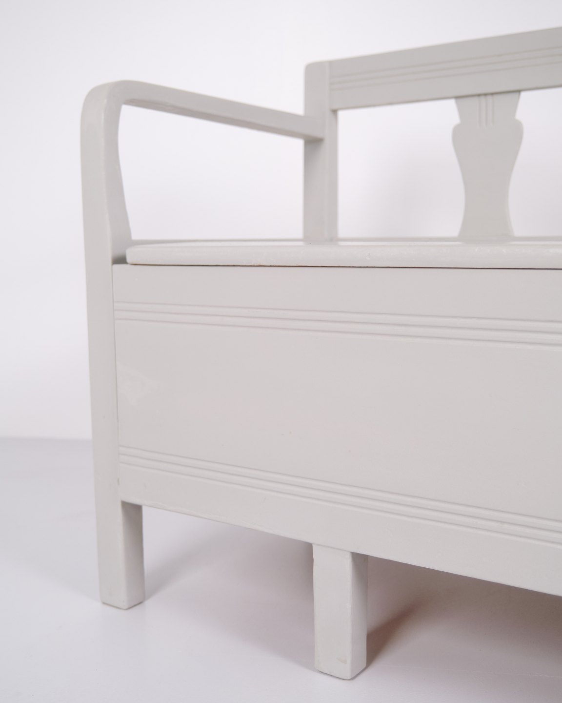 Antique beater bench from the 1860s in gray painted pine. Classic folk design with seating and storage. Historical and functional furniture.— Origin: Denmark / Scandinavia
