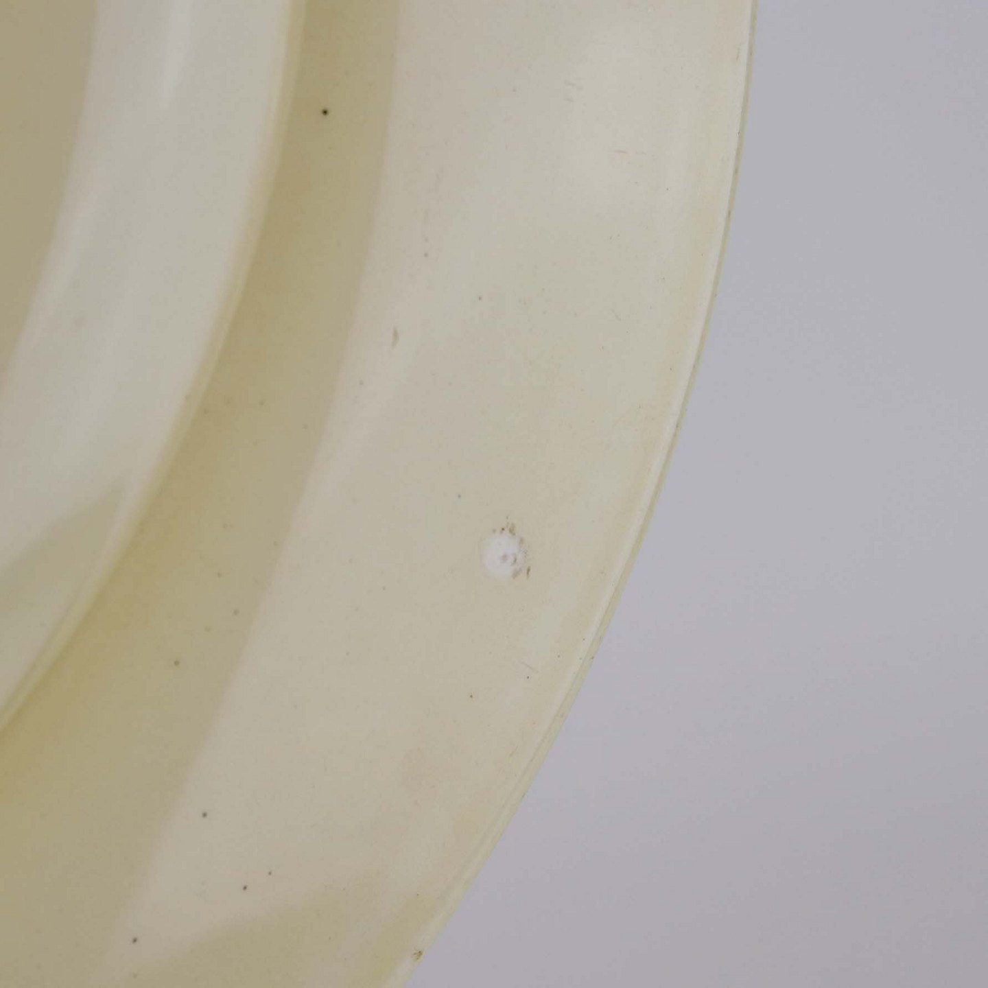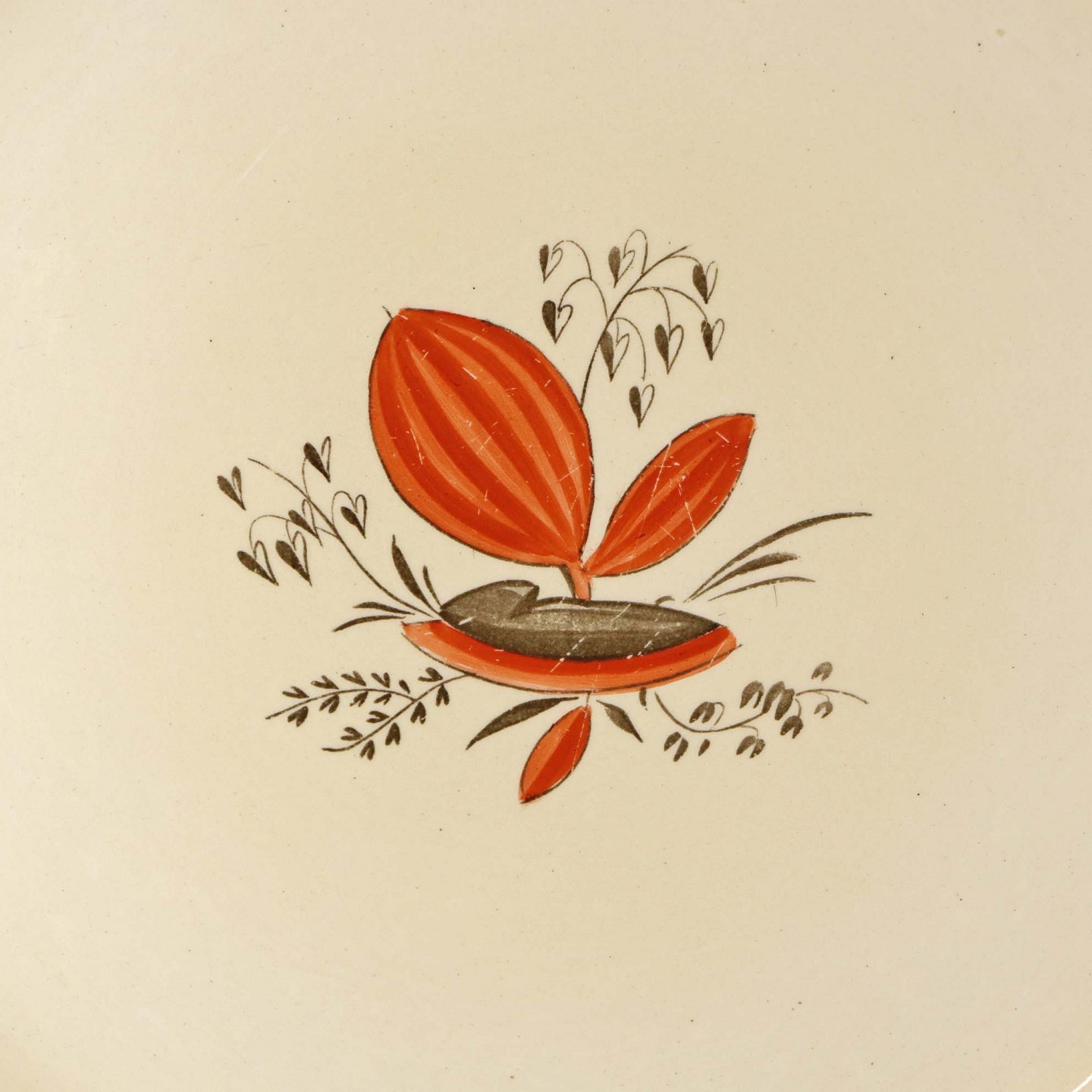 Fremstår med brugsspor på dekorationen samt ujævnhed i glasuren på bagsiden af fadet.