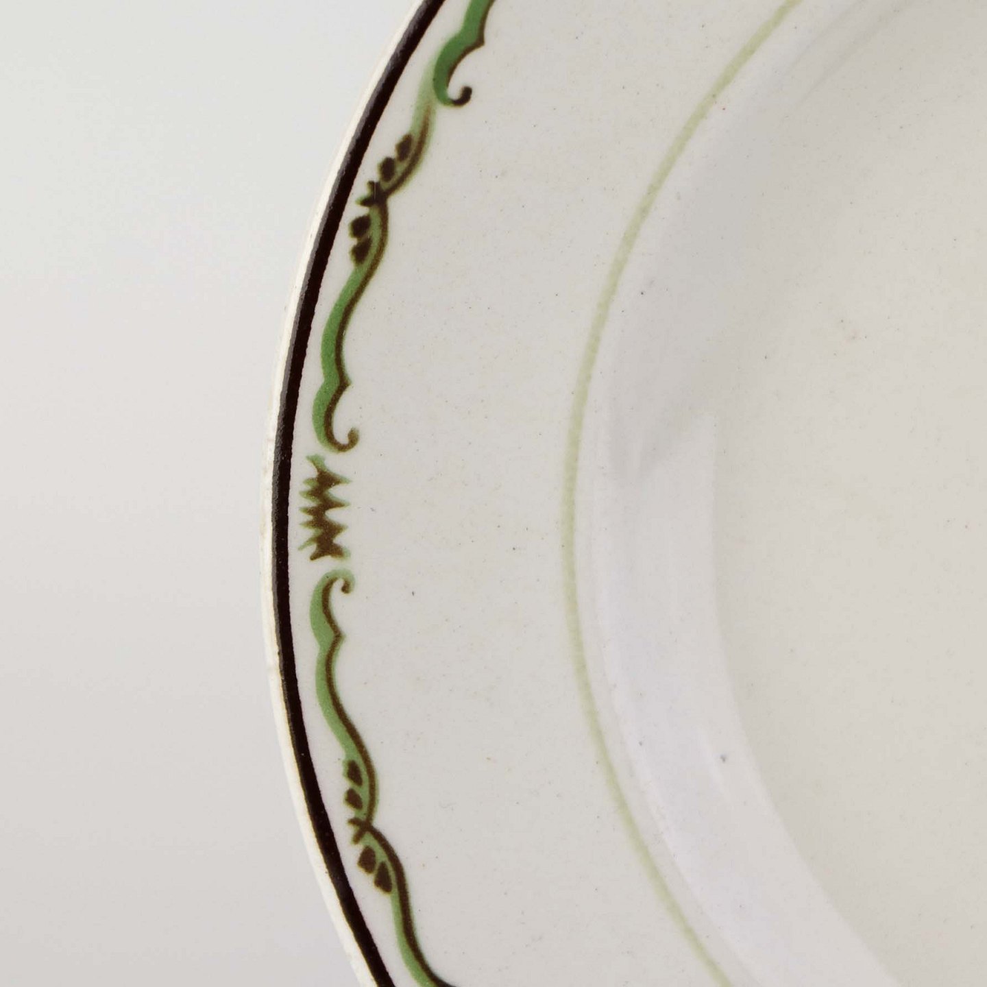 Fajancestel i stelform G med dekoration af orangegule blomster og grønne guirlander på lys baggrund med brun kant.
