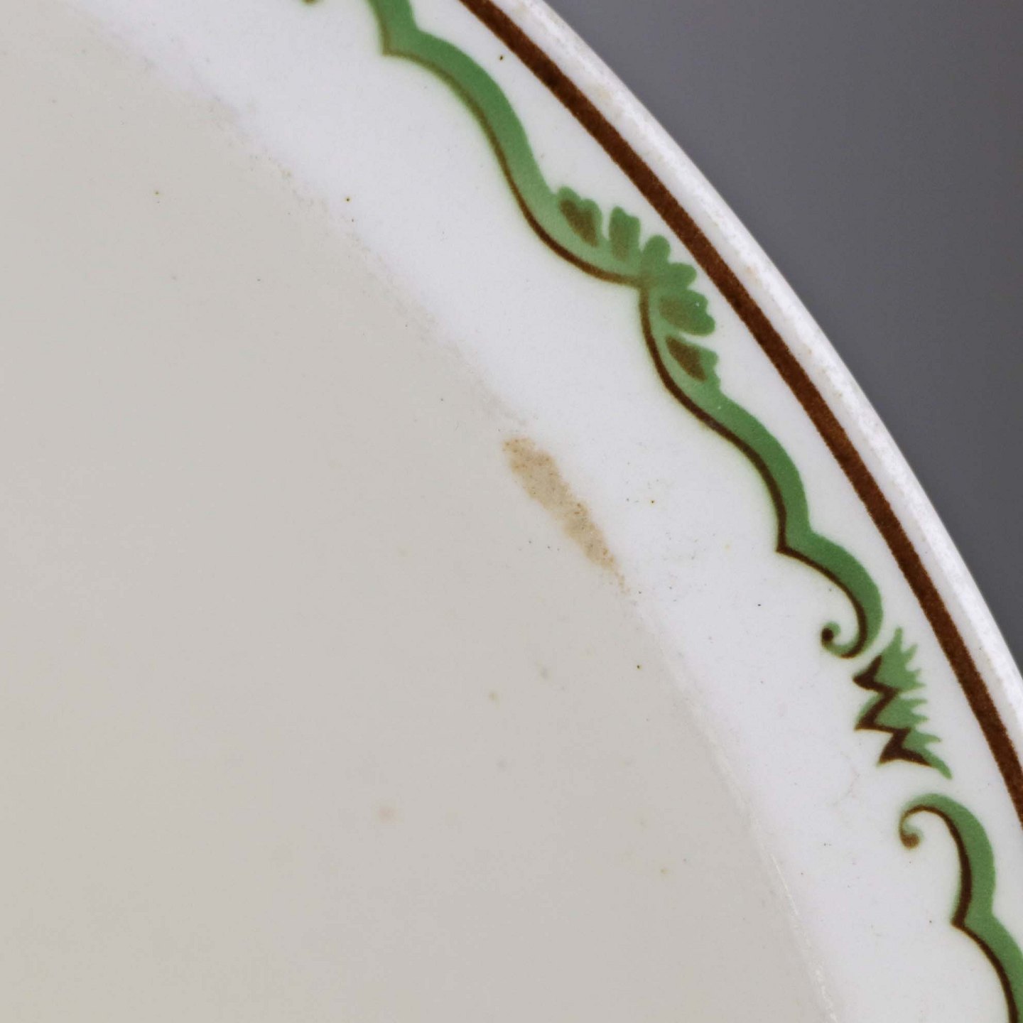 Fajancestel i stelform G med dekoration af orangegule blomster og grønne guirlander på lys baggrund med brun kant.