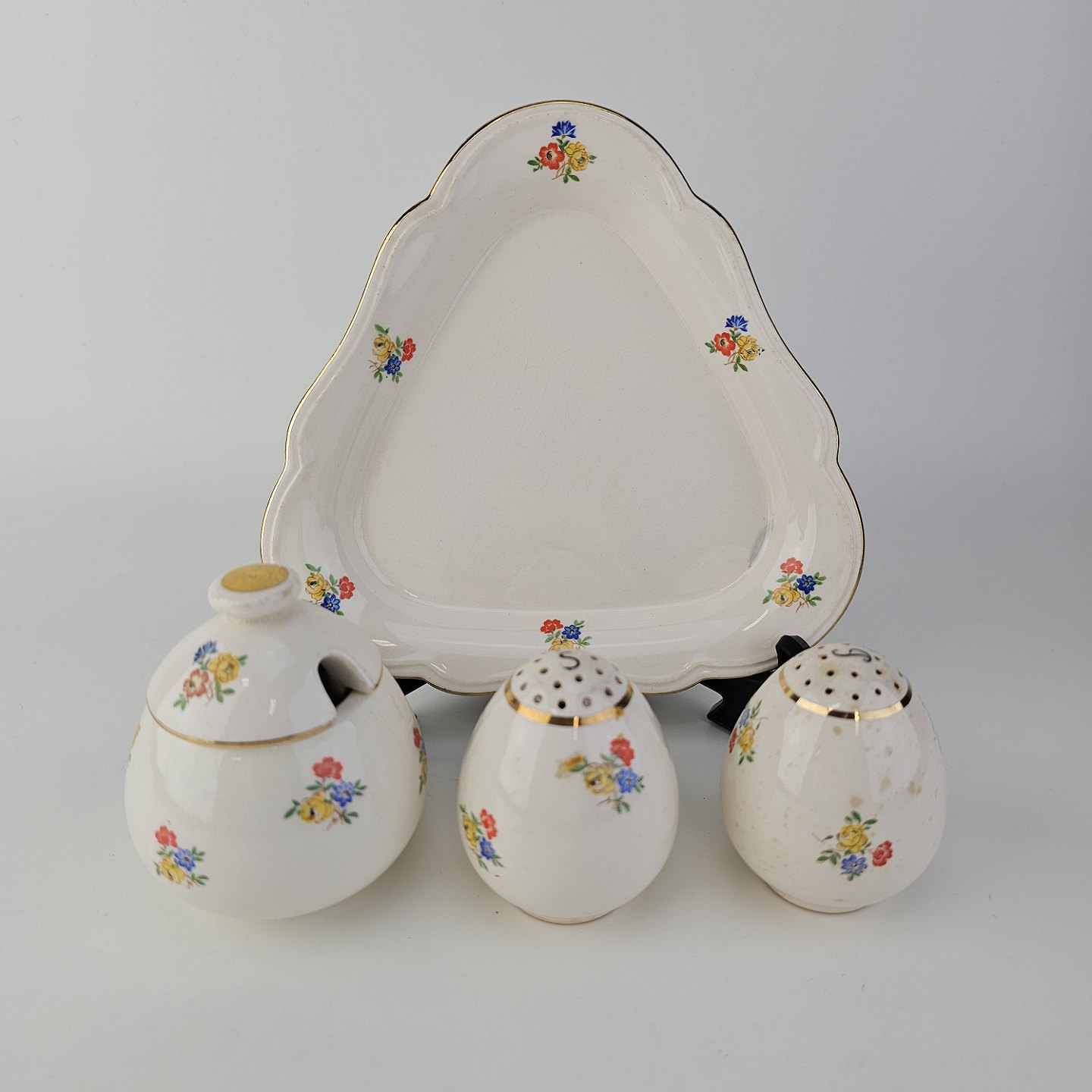 Trekantet fad med sennepskrukke, saltbøsse og peberbøsse i fajance fra stellet Anna SofieDesign Nils Thorsson