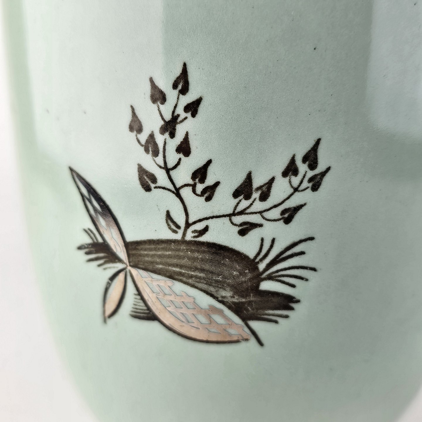 Stel i lysegrøn fajance med natur dekoration og flettet kant