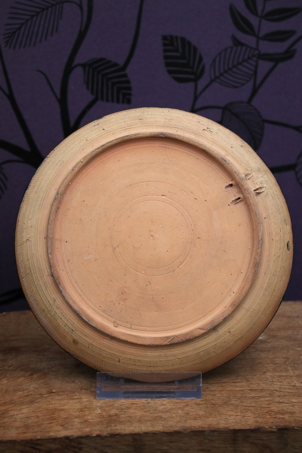 Old terracotta plate / platter with a painted motif of the Christmas stamp from Christmas 1938-Denmark. Dia.: 17.5cm. Can be used as a serving plate or hung as a plate on the wall. Dealer