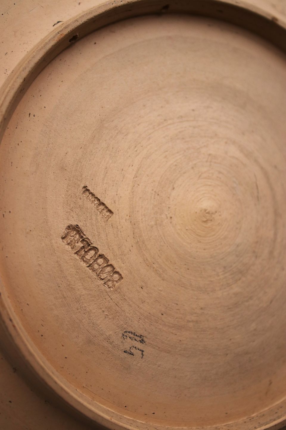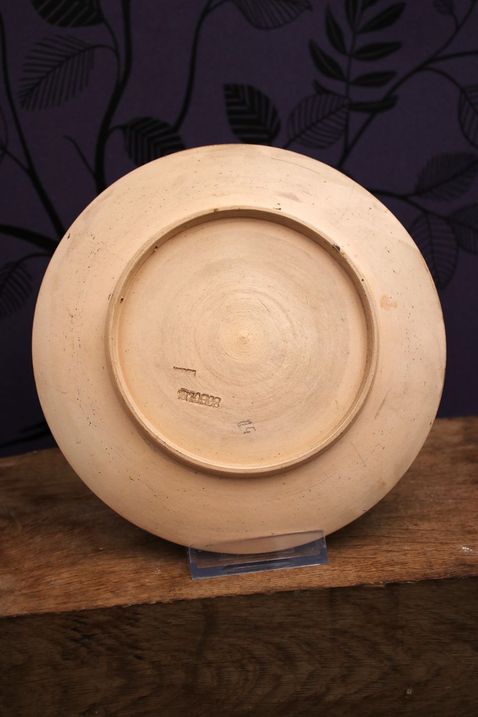 Old Christmas plate in terracotta with a motif of a family of elves gathered around rice porridge and Merry Christmas written at the bottom. Dia.: 18.5cm. Dealer