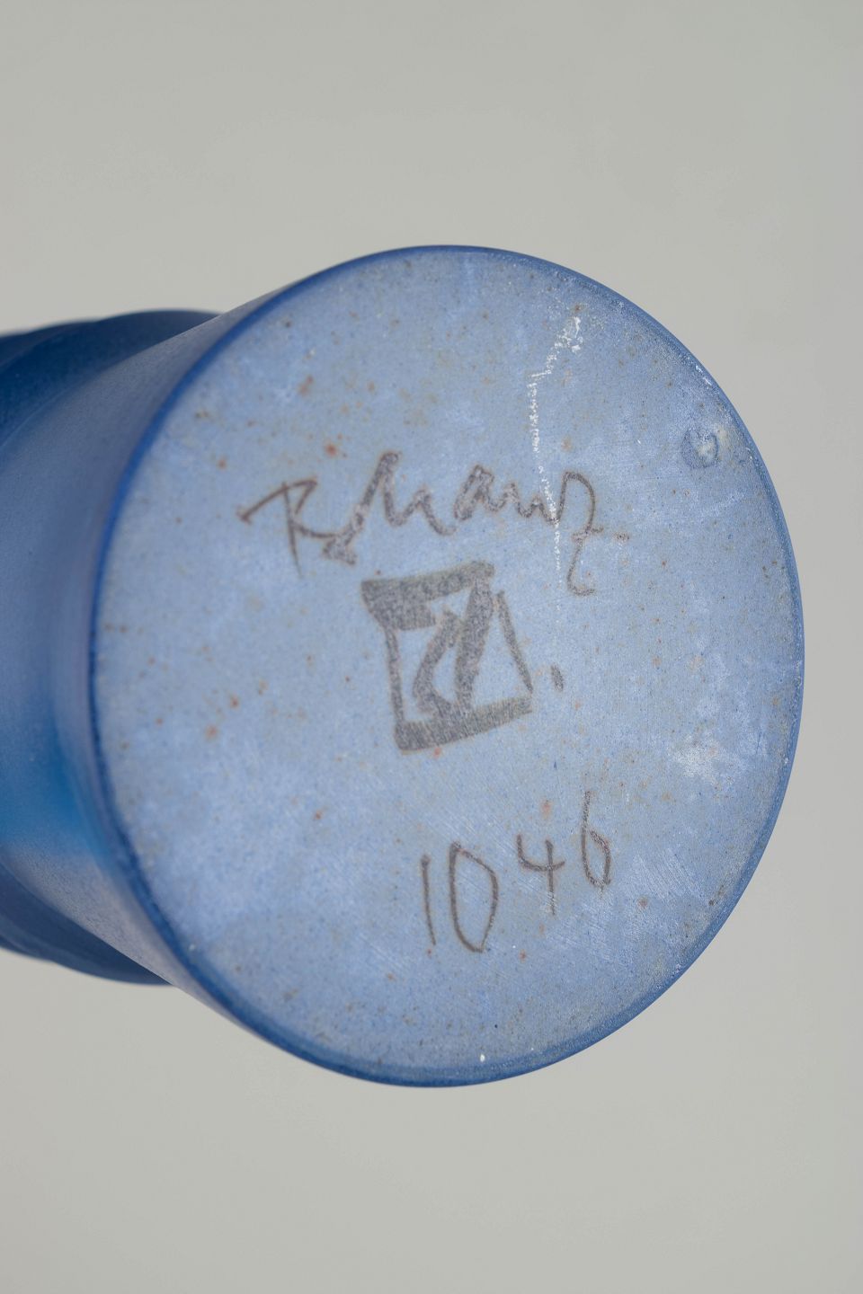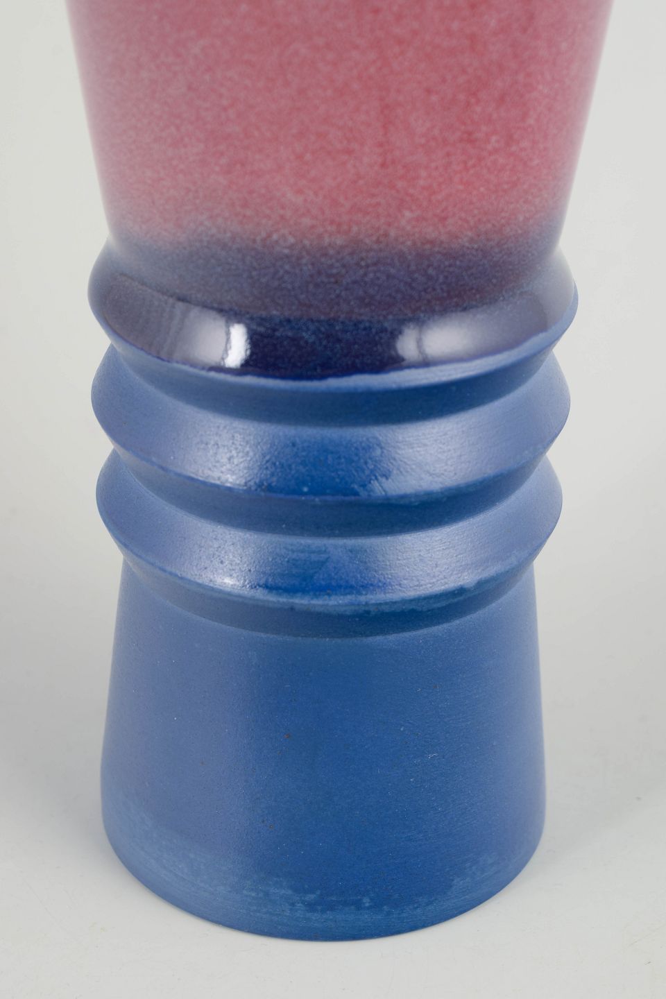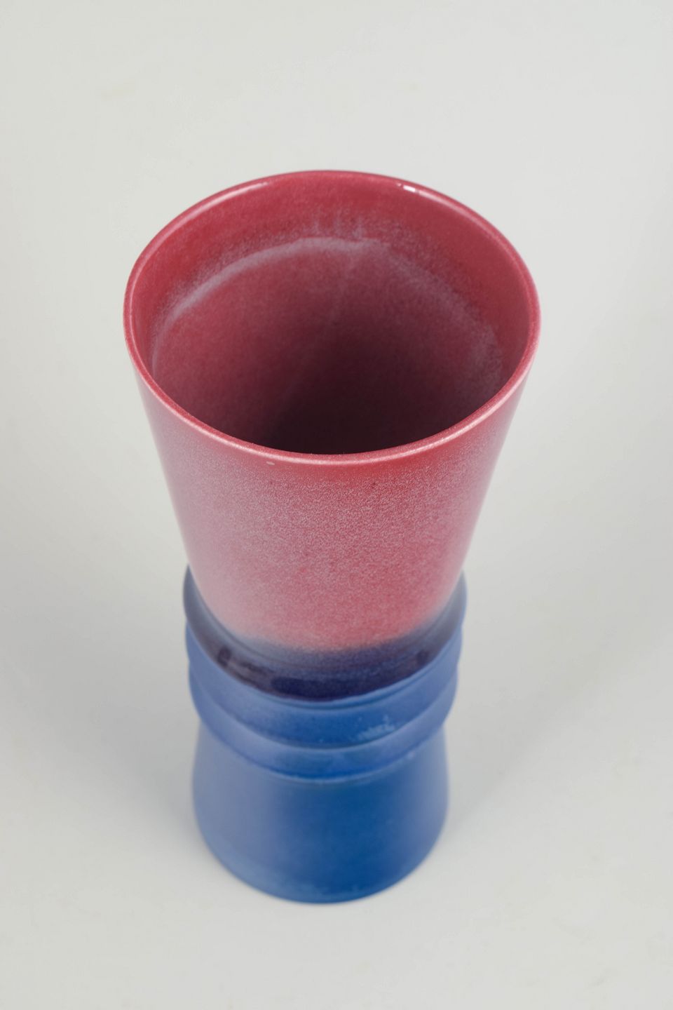 Richard Manz, unique vase.Sculptural vase in thrown stoneware with a strong, architectural silhouette. Finished with a glossy glaze in deep blue tones to the lower section and a red-violet upper field, characteristic of experimental Scandinavian studio ceramics from the 1960s. The stepped central section adds a pronounced modernist expression.