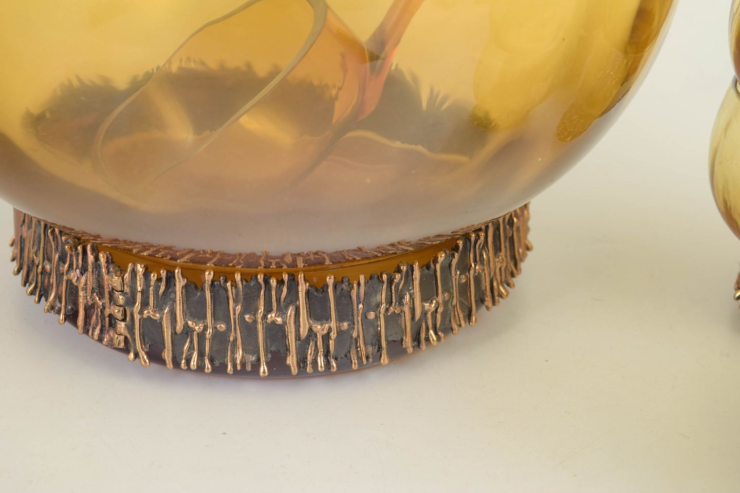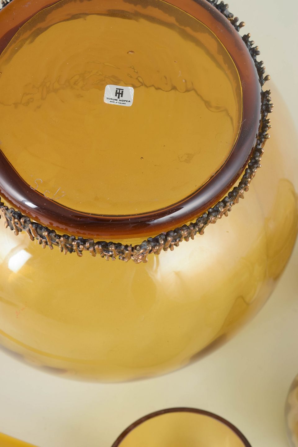 Pentti Sarpaneva for Turun Hopea, punch bowl set.Punch bowl set in amber-toned mouth-blown art glass with a distinctive metal base, comprising a large punch bowl, 6 glasses, and a matching ladle. The sculptural design is defined by the contrast between the warm glass and the raw, textured metal foot.