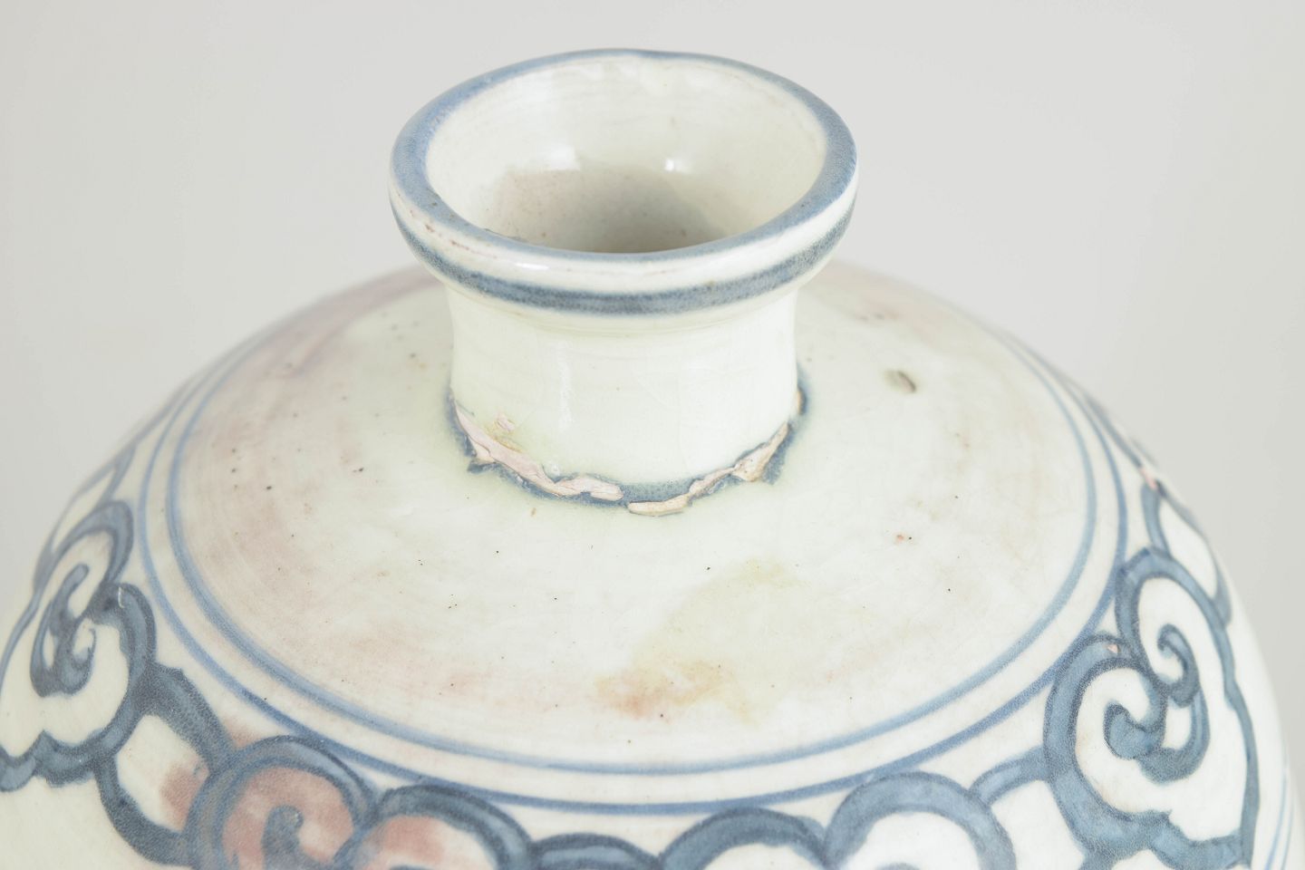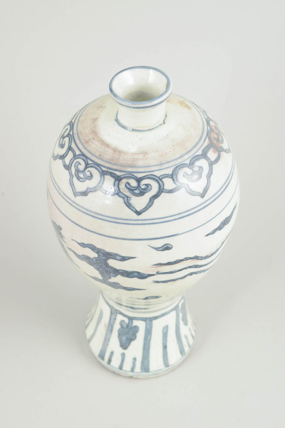 China, vase. Late Ming dynasty.Baluster-form porcelain vase with a waisted neck and spreading foot, decorated in underglaze blue. The decoration depicts a phoenix (fenghuang) flying among stylised clouds, a classic Chinese auspicious motif associated with virtue, harmony, and imperial symbolism. Ornamental borders accent the shoulder and foot. Well-balanced and traditional form.