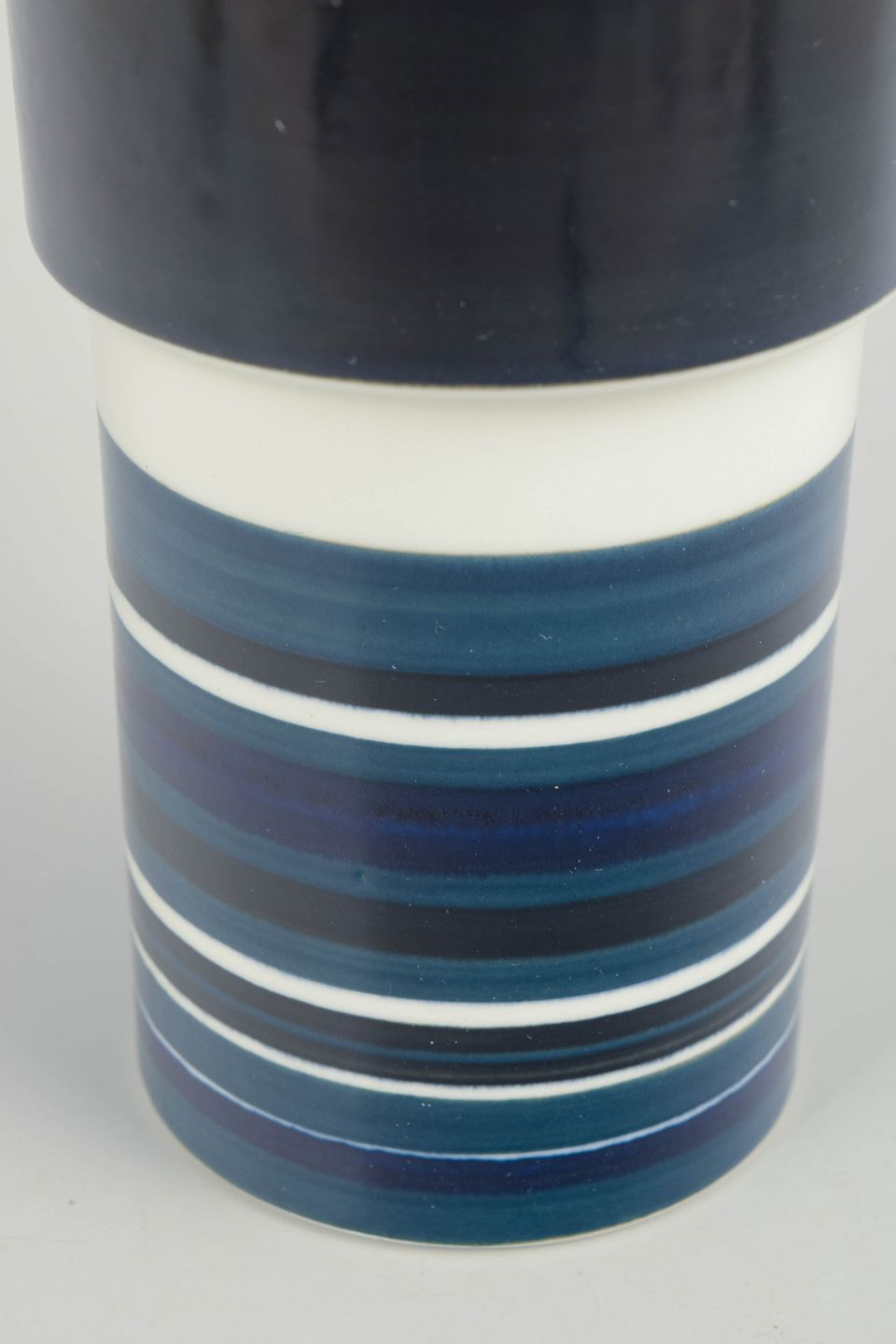 Arabia, unique vase.Tall cylindrical stoneware vase with a graphic composition, featuring a deep dark glazed upper section and horizontal banding in blue, grey, and white tones to the lower part. The piece is signed GS/PR.