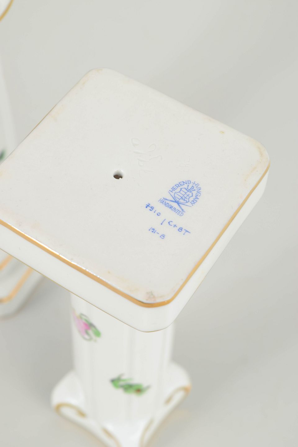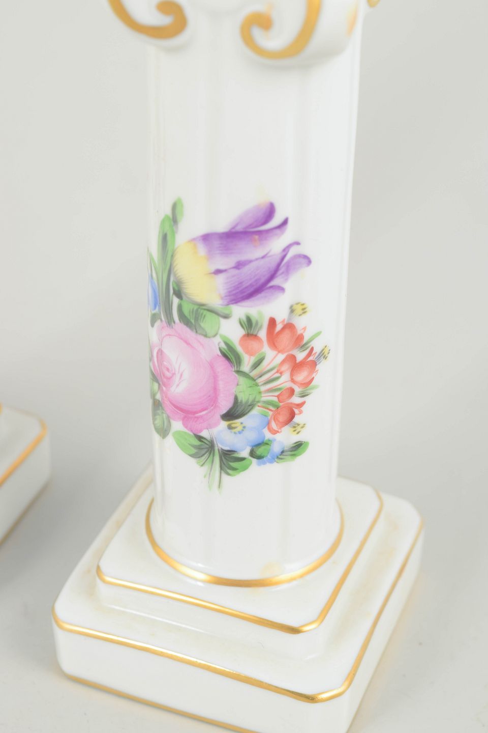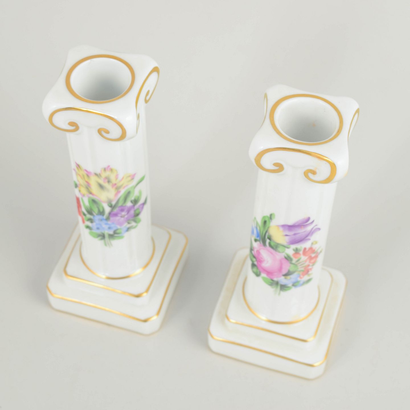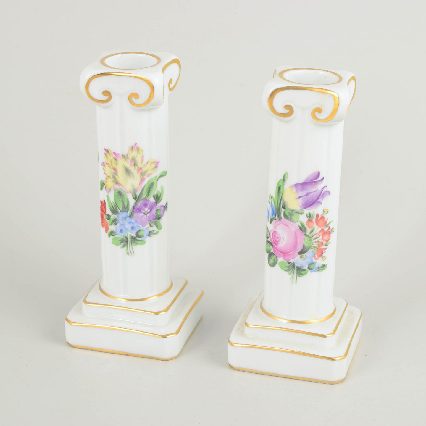 Herend, pair of candlesticks.Hand-painted pair of candlesticks in glazed porcelain with floral decoration in pink, purple, blue and green tones. Slender baluster-shaped columns on square bases with moulded details and subtle gilt accents along the edges and ornamentation. Each candlestick is individually decorated with slight variations in the floral motifs.