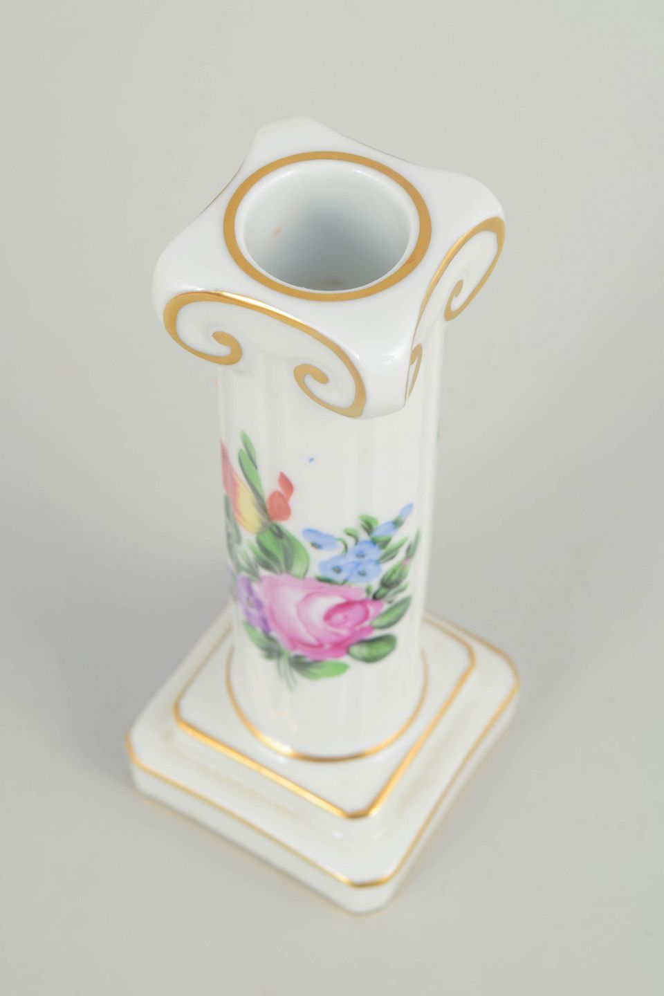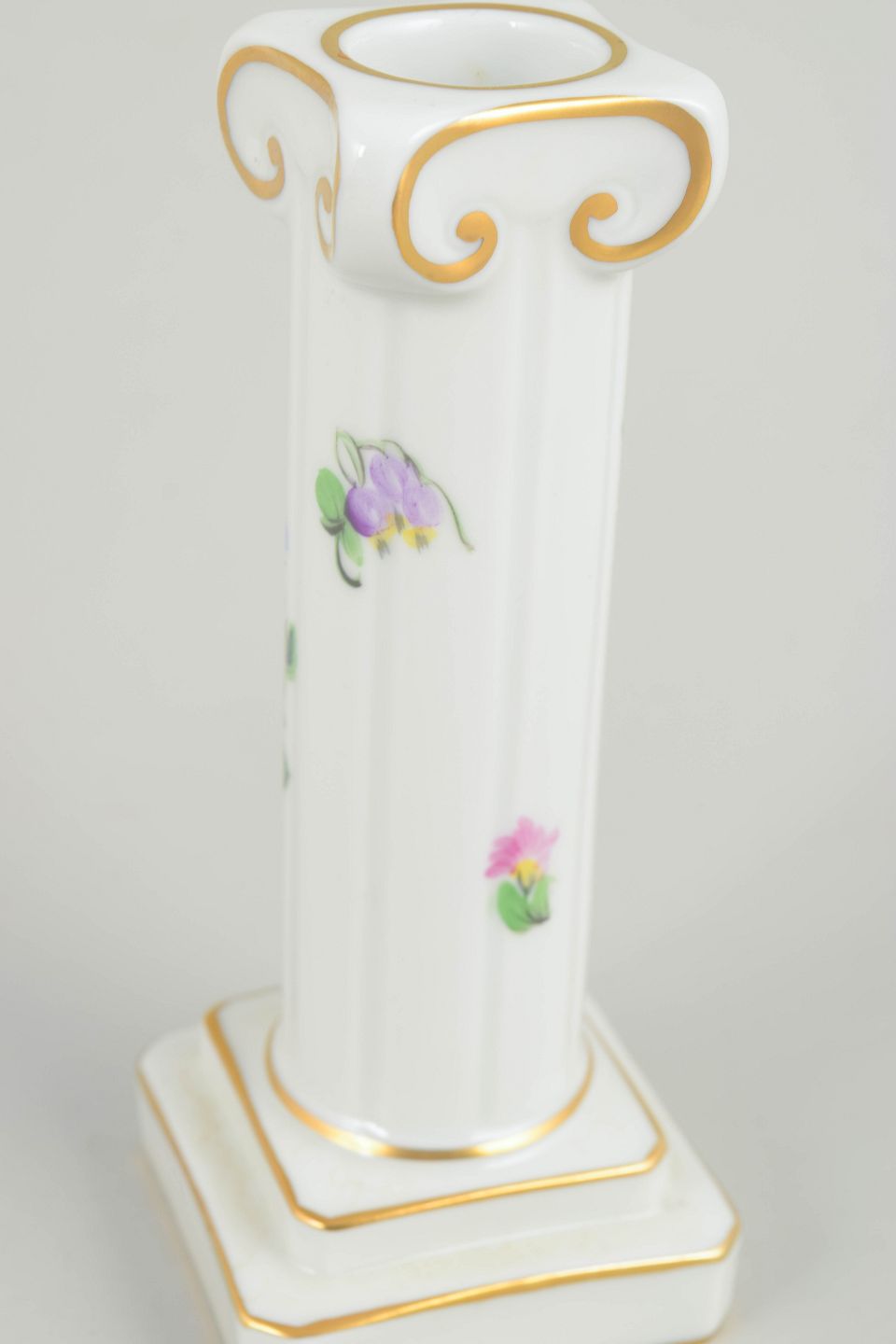 Herend, candlestick.Hand-painted candlestick in glazed porcelain with floral decoration in pink, purple, blue and green tones. Slender baluster-shaped column on a square base with moulded details and subtle gilt accents along the edges and ornamentation.