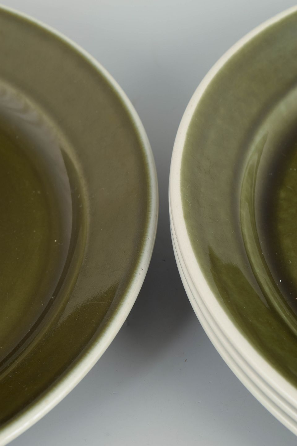 Stig Lindberg for Gustavsberg, set of 4 dinner plates.Set of four dinner plates in glazed stoneware from the "Vardag" series. The plates feature a simple, functional design with a wide rim and deep centre, finished in a characteristic green glaze with dark edging, typical of Stig Lindberg’s everyday tableware from the 1970s.