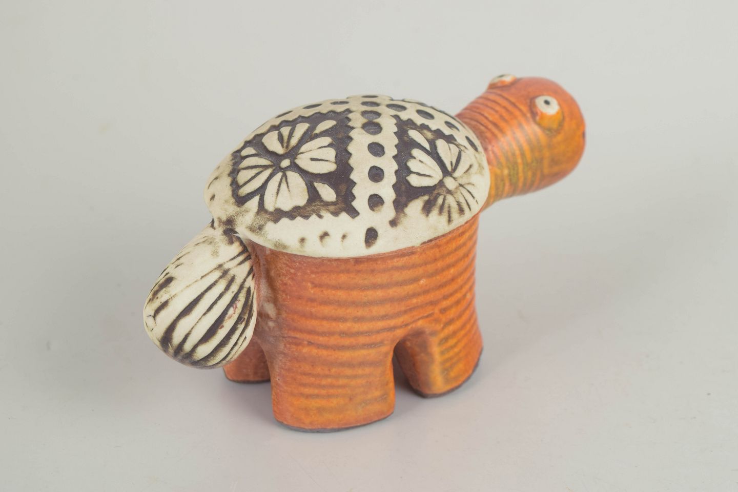Lisa Larson for Gustavsberg, turtle figurine.Stylised stoneware turtle with a compact, almost architectural body and short, sturdy legs. Finished with a warm orange-brown glaze to the body and a contrasting shell decorated with graphic floral and dot motifs in black and off-white. A characteristic example of Lisa Larson’s figurative design from the 1970s, combining humour, simplicity, and strong decorative presence.