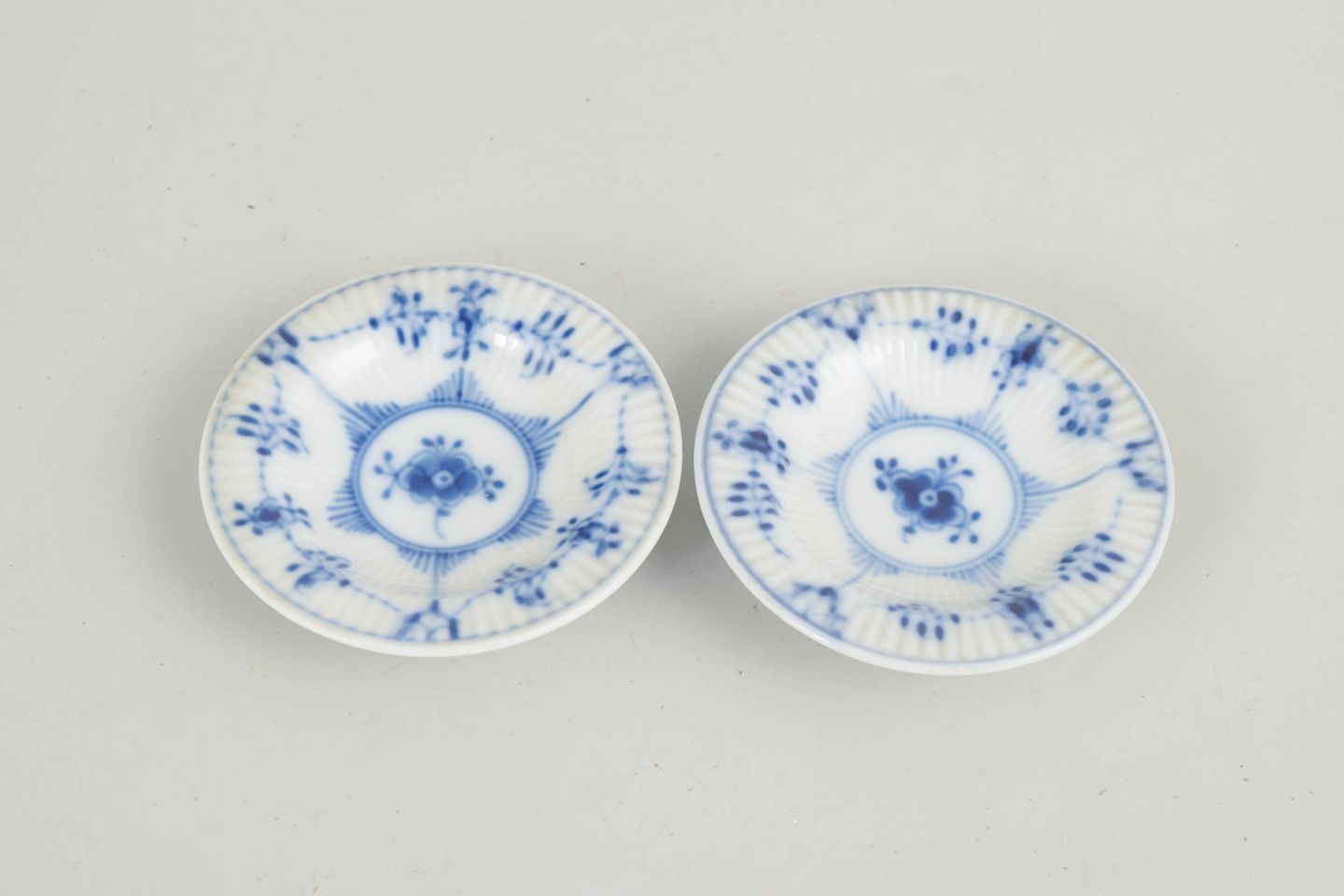 Royal Copenhagen, set of 2 caviar dishes or butter pads, Blue Fluted Plain.Set of two small fluted dishes in glazed porcelain with hand-painted cobalt-blue underglaze decoration. Low, rounded form with a slightly raised foot. Model 1/7.