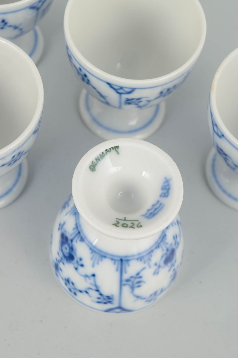 Set of five fluted egg cups in glazed porcelain with hand-painted cobalt-blue underglaze decoration. Classic footed form with gently flared bowl. Model 1/2026.