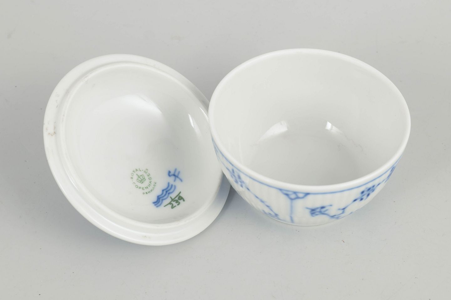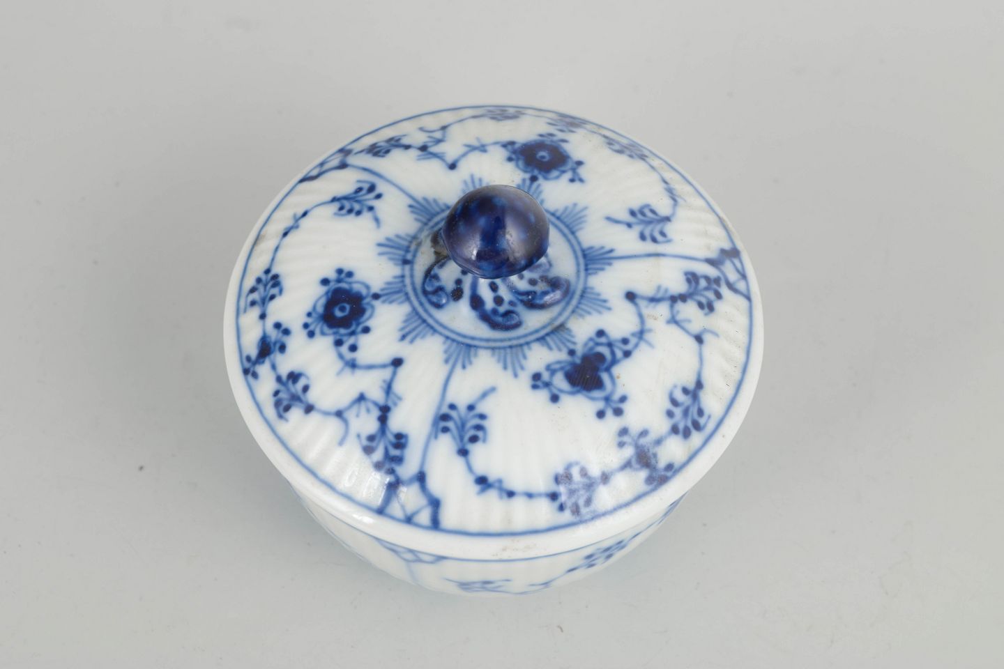 Royal Copenhagen, sugar bowl, Blue Fluted Plain.Fluted sugar bowl in glazed porcelain with hand-painted cobalt-blue underglaze decoration. Classic rounded form with matching lid topped by a finial.
