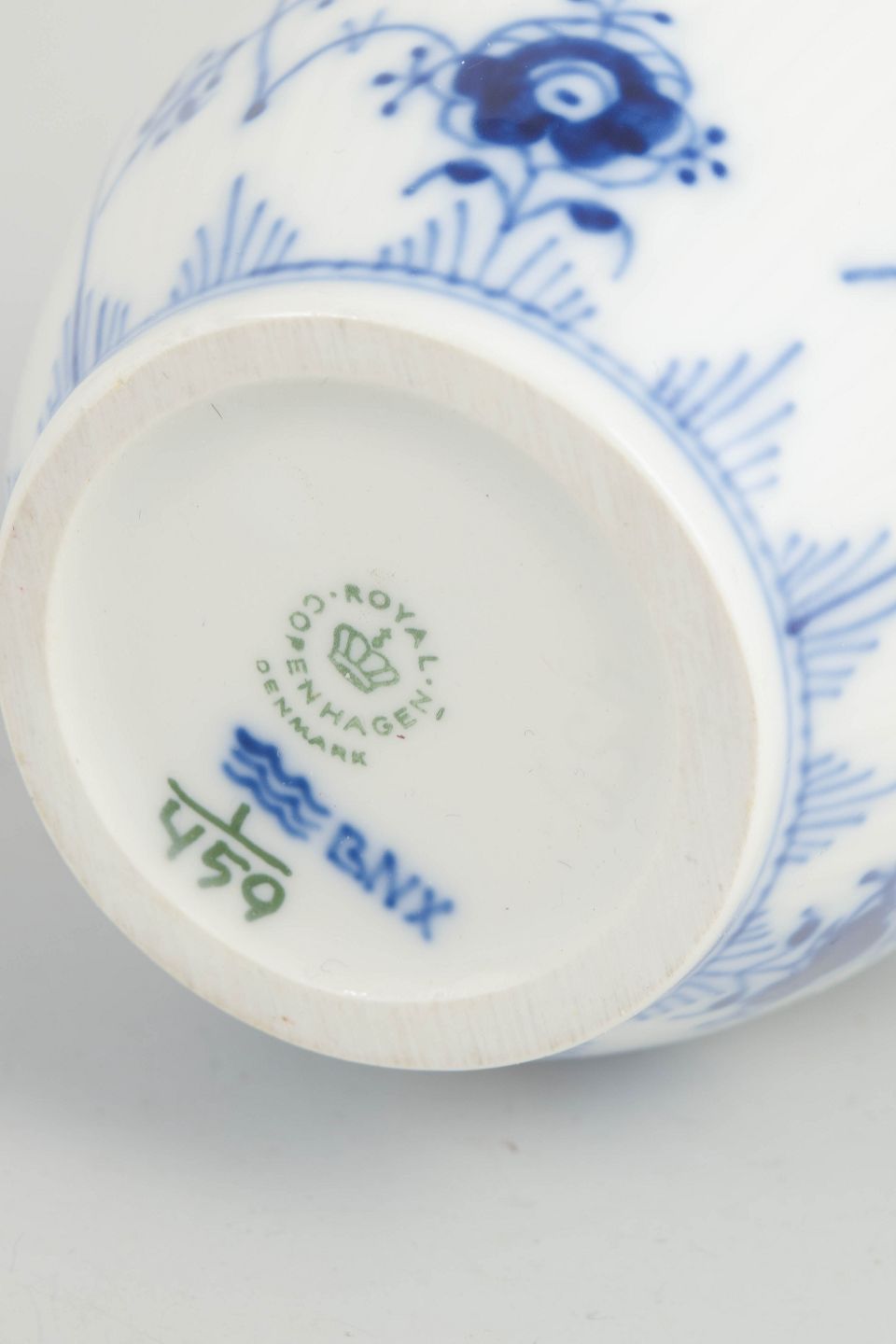Fluted creamer in glazed porcelain with hand-painted cobalt-blue underglaze decoration. Classic baluster-shaped body with a curved spout and decorative handle. Model 1/459.