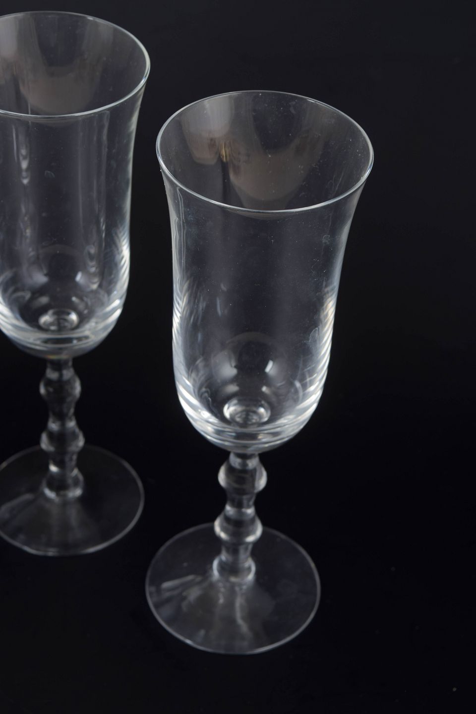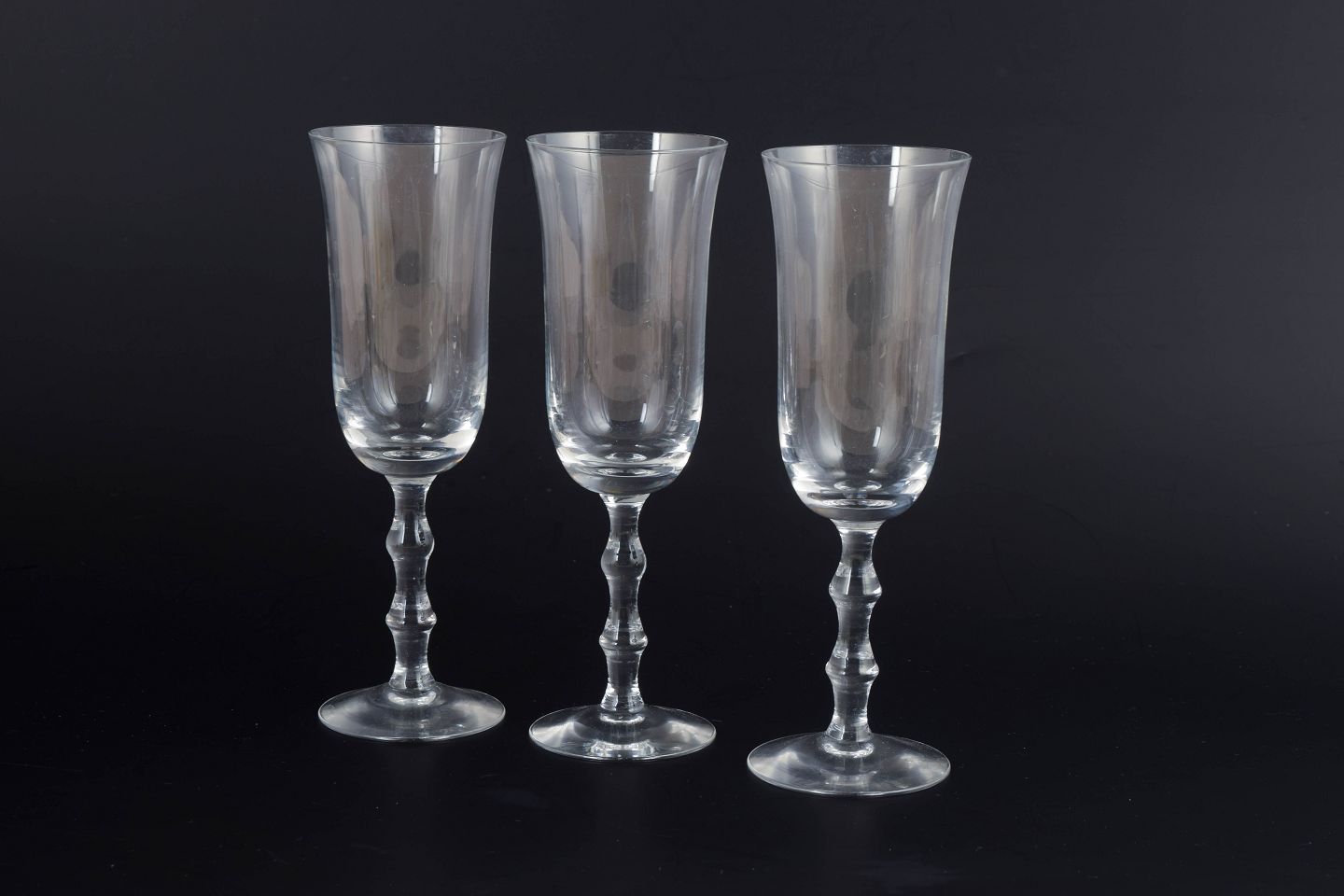 Simon Gate for Orrefors, set of 3 champagne glasses.Set of three champagne glasses in clear glass with a slender bowl and a baluster-shaped stem on a round foot. A classic Scandinavian silhouette with light, well-balanced proportions, executed in Orrefors’ renowned clear glass quality. Model : “Salut”.