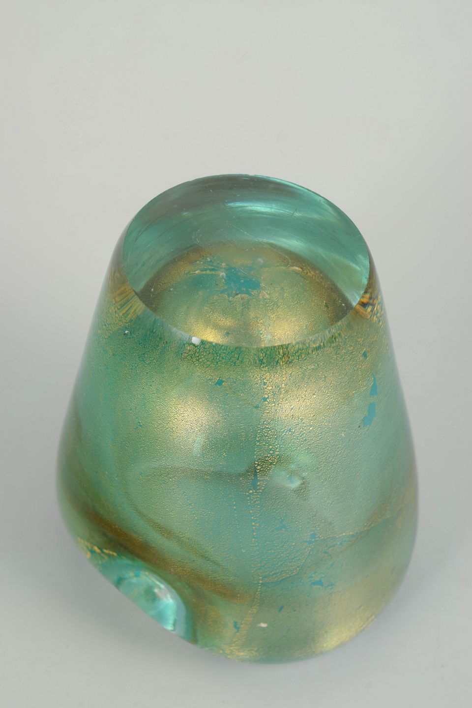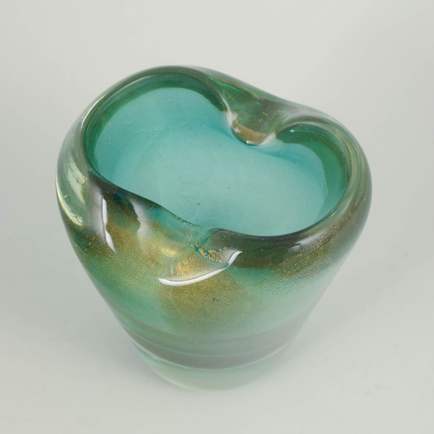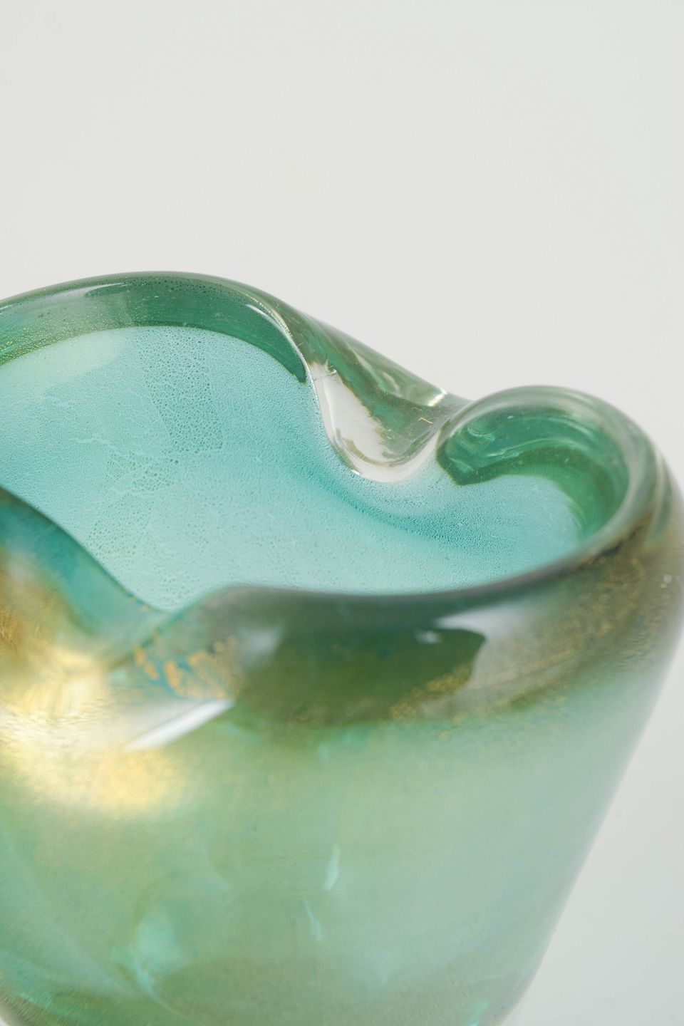 Murano vase.Sculptural vase in mouth-blown art glass with a free, organic opening and a gently asymmetrical rim. The glass is rendered in clear turquoise-green tones with golden inclusions, creating depth and a soft, vibrant interplay of colour. The solid, clear base provides a stable foundation and forms an elegant contrast to the coloured upper section. The form and treatment of the material are characteristic of Murano art glass from the mid-20th century.