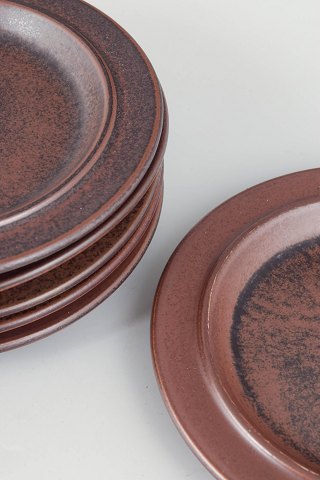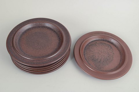 Ulla Procopé for Arabia, Ruska salad plates, set of 6.Set of six stoneware salad plates from the Ruska series by Arabia, finished in the distinctive mottled brown glaze in warm earth tones. Classic circular form with a gently raised rim and a lively glaze surface, where natural variations give each plate an individual character.