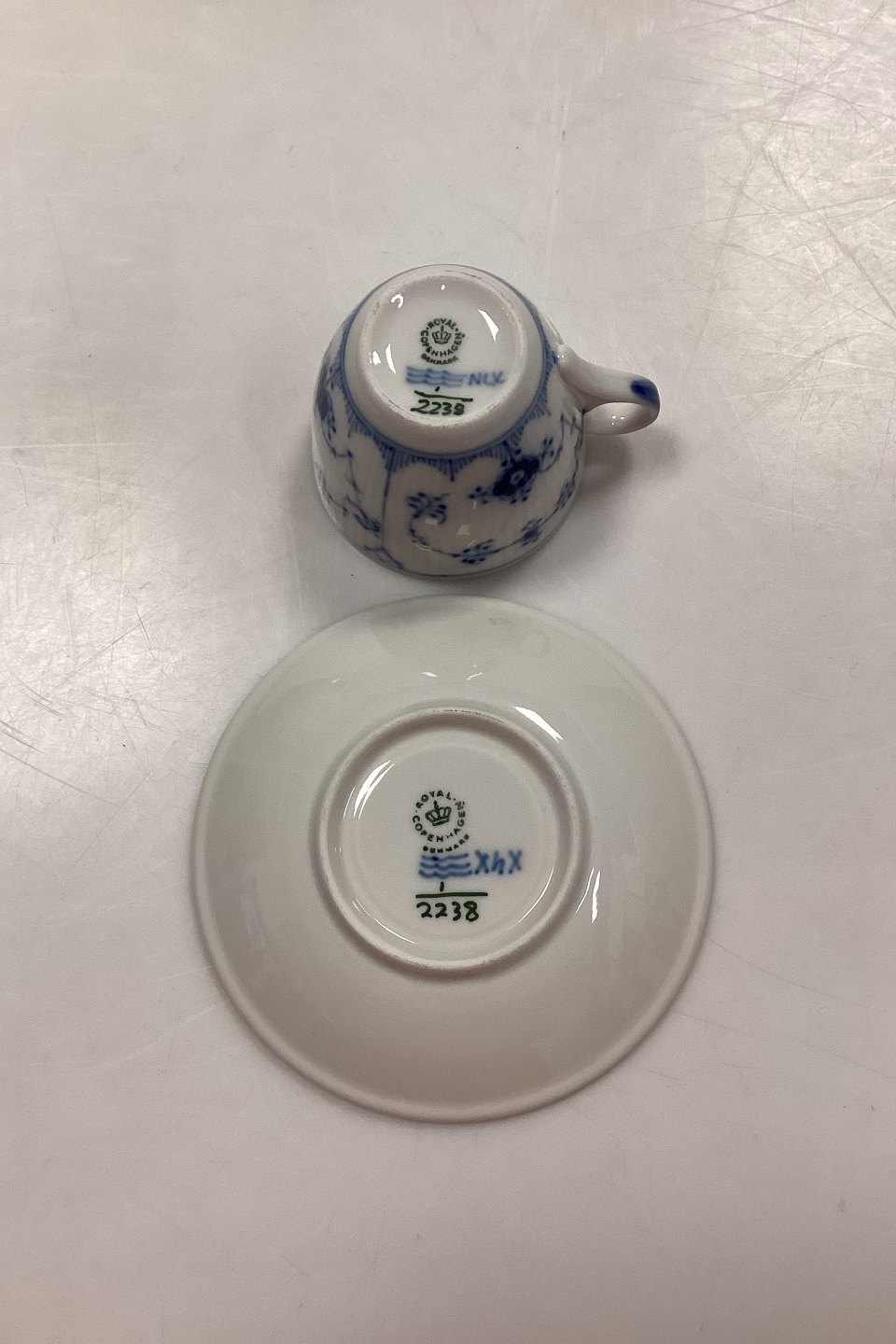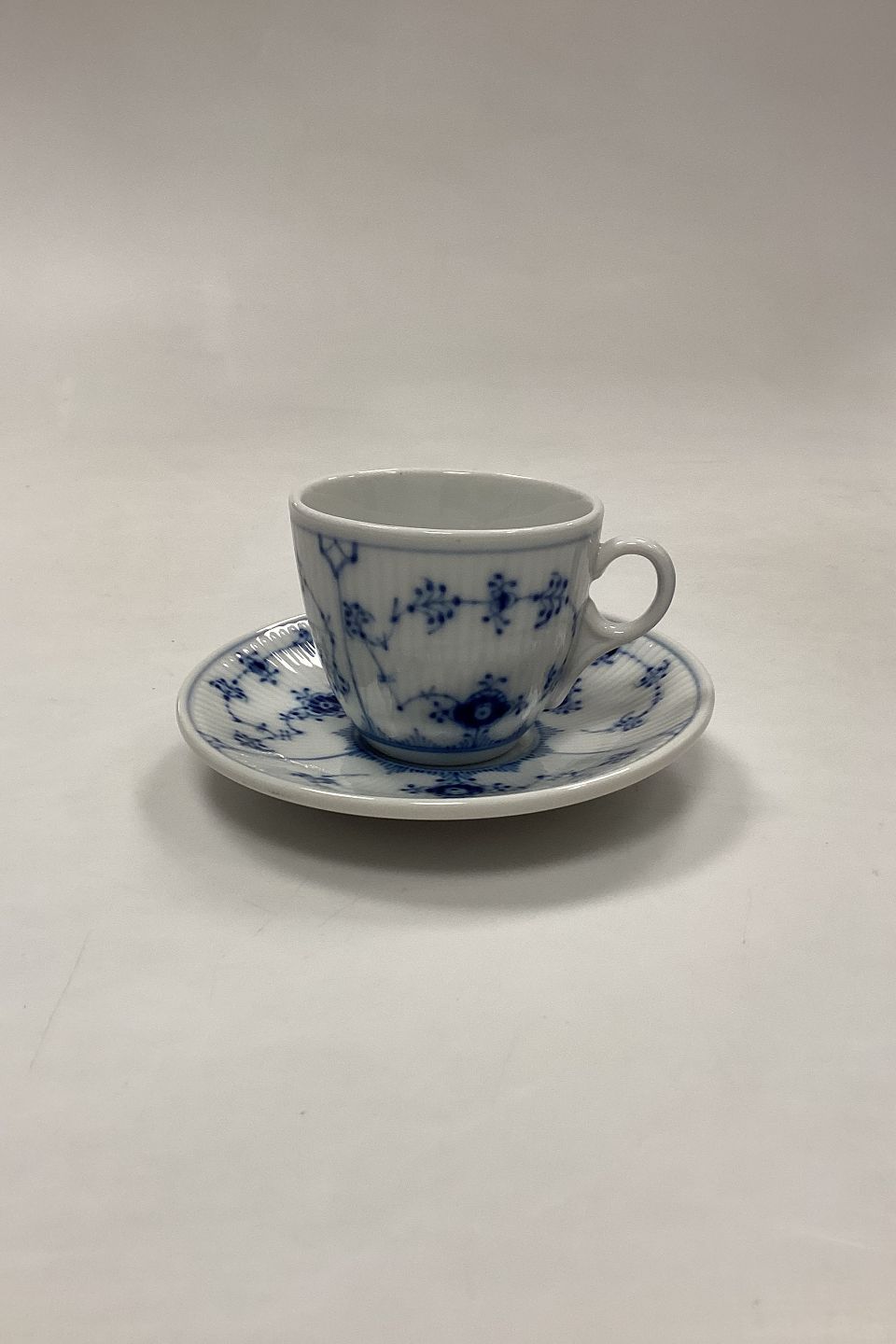 Royal Copenhagen Blue Fluted Plain Hotel Coffee Cup and Saucer No. 2238.Dimensions: Cup 6.2 cm x 7.5 cm dia. / 2.44 in. x 2.95 in. Saucer 13.5 cm / 5.31 in.